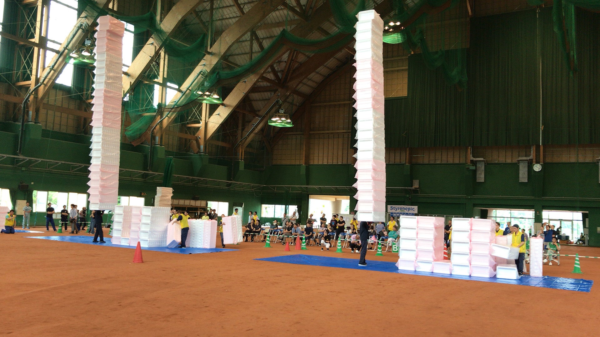 - ゲームでは発泡スチロールの箱を積み上げてタイムや高さを競う
