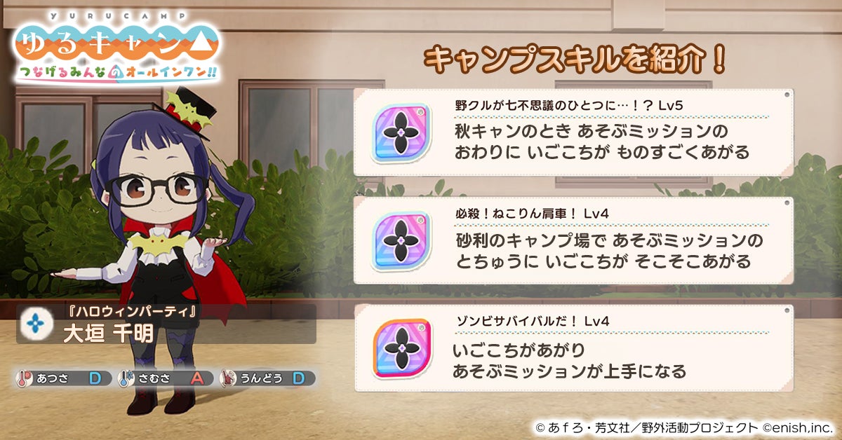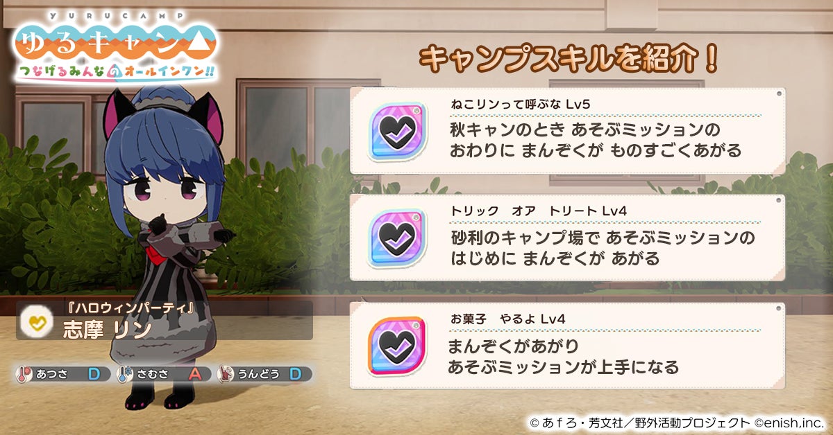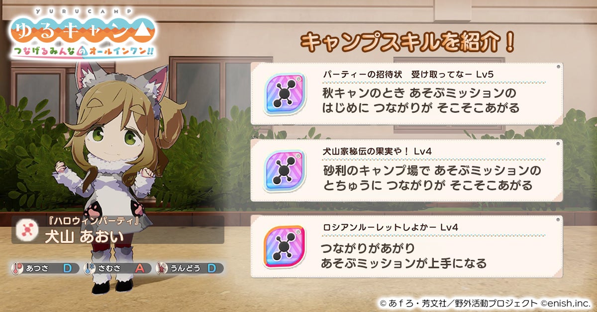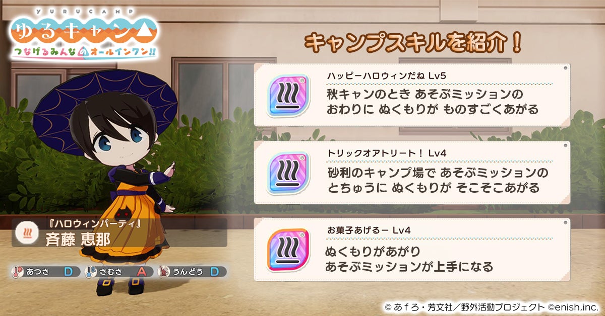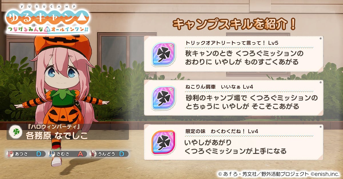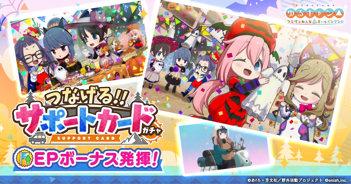 株式会社enishは、TVアニメ『ゆるキャン△』初のオンラインゲーム「ゆるキャン△ つなげるみんなのオールインワン!!」にて、新イベント「みんな集まれ! ハロウィンパーティーの招待状」を開催します。