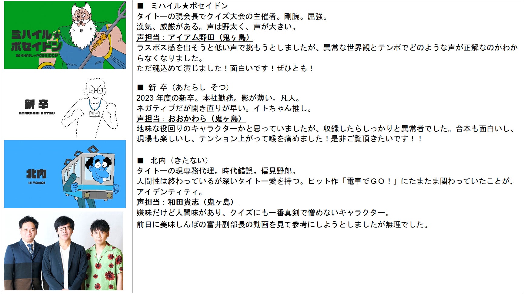 このアニメは、タイトーの歴史や取り組みを伝えるために制作された3分から5分のショートアニメーション動画で、全7話で「第一回ワクワク社長争奪クイズ大会」の決勝戦の模様をお届けします。