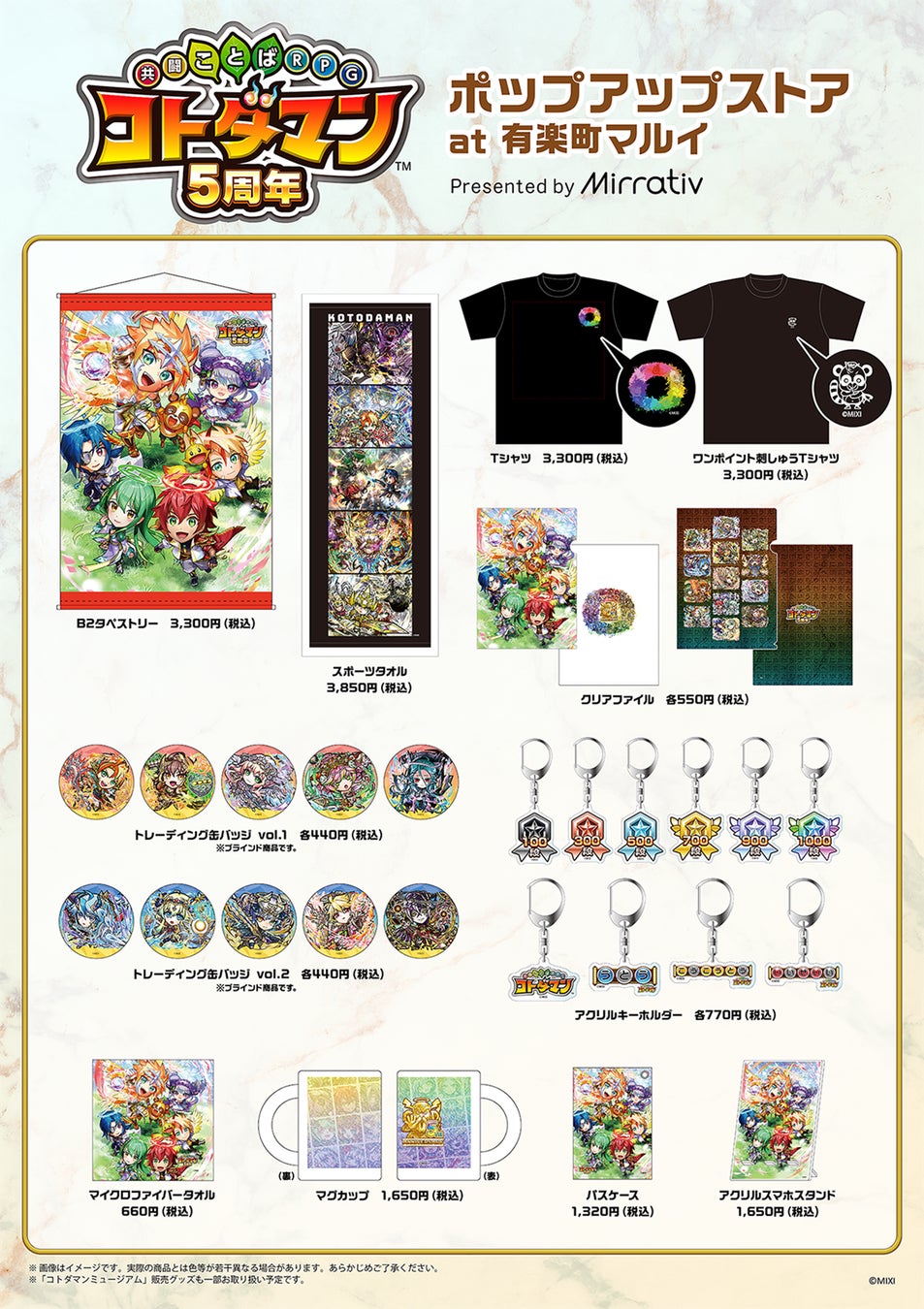 「共闘ことばRPG コトダマン」が、ミラティブと共同制作した「ポップアップストア限定 コトダマン5周年記念グッズ」を公開した。