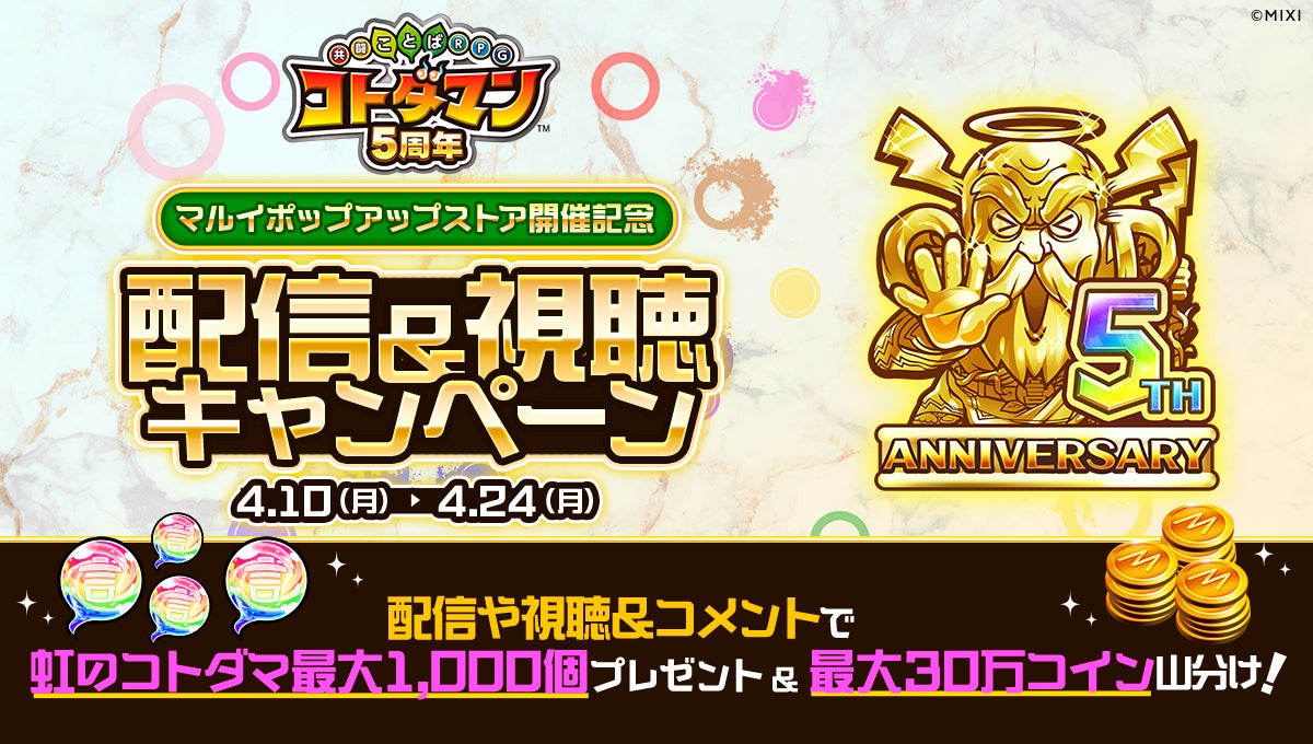 株式会社MIXI(本社:東京都渋谷区、代表取締役社長:木村 弘毅)が展開するスマホアプリ「ことば」で闘う新感覚RPG「共闘ことばRPG コトダマン」(以下、コトダマン)は、株式会社ミラティブ(本社:東京都目黒区 代表取締役:赤川隼一)が運営するゲーム配信プラットフォーム「Mirrativ(ミラティブ)」(以下Mirrativ)と共同制作した「ポップアップストア限定 コトダマン5周年記念グッズ」を公開しました。