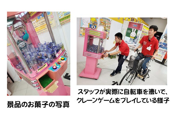 参加者は2人1組で、1人が自転車を漕ぎ、もう1人がクレーンゲームを操作します。