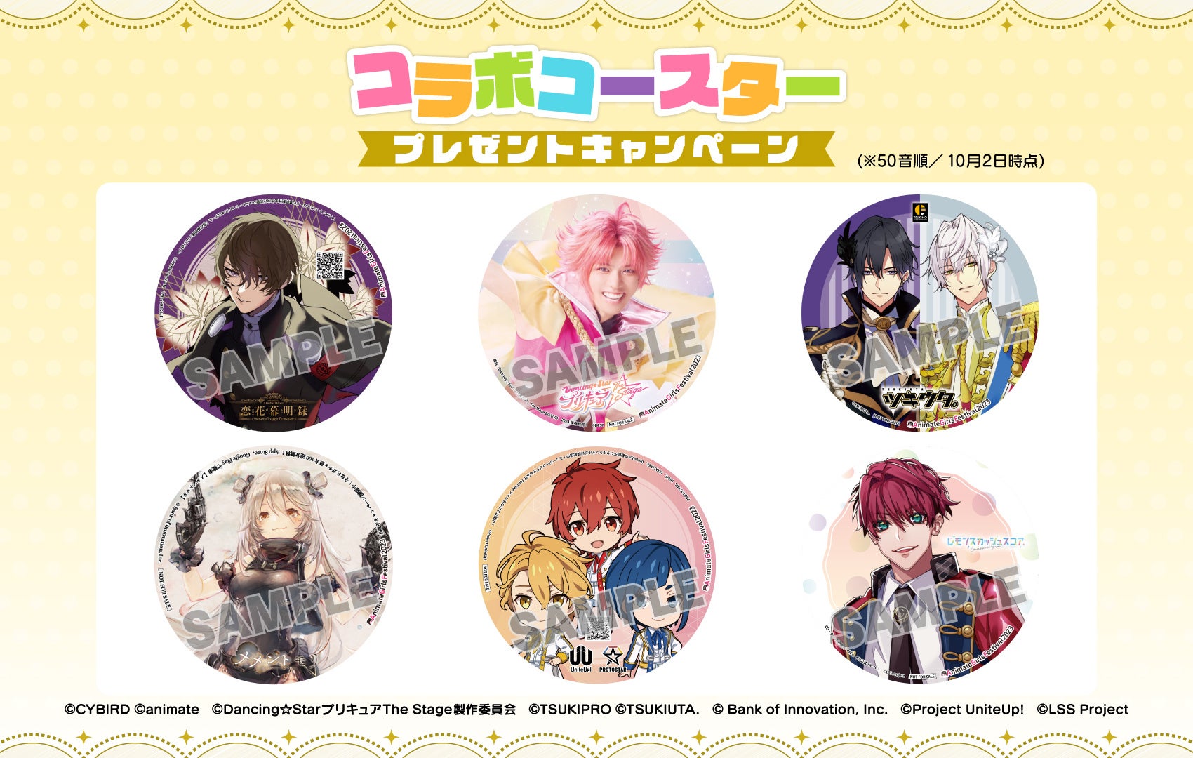 池袋の飲食店やアニメイト対象店舗を利用すると、恋花幕明録、『Dancing☆Starプリキュア』The Stage、ツキノ芸能プロダクション、メメントモリ、TVアニメ『UniteUp!』、『レモンスカッシュスコア』の6作品とコラボした絵柄のコースターがプレゼントされます。