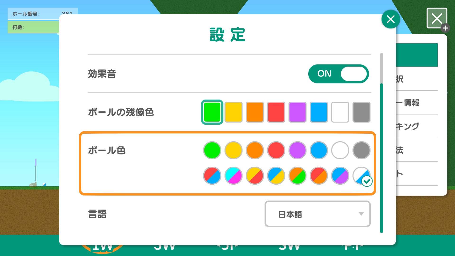 - ボールの色やプレイヤーアイコンのカスタマイズが可能になり、ホールインワン回数も確認できるようになった