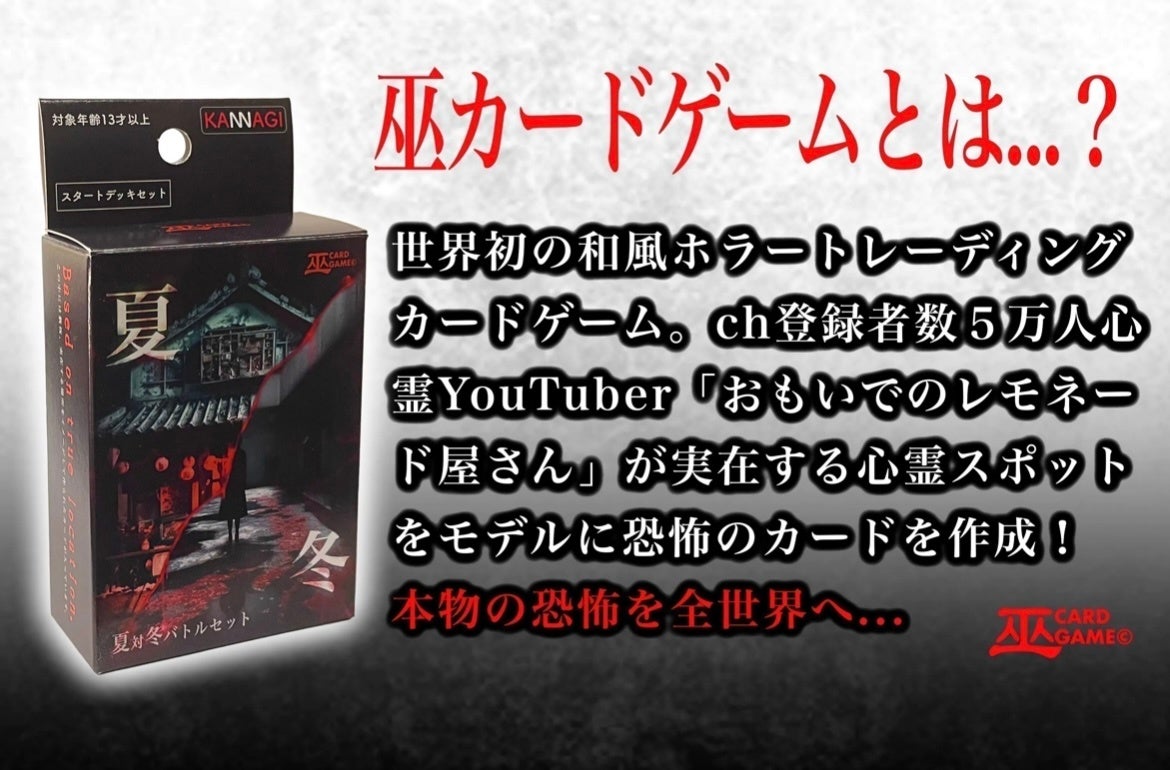 心霊Youtuber「おもいでのレモネード屋さん」が、国内300ヶ所以上の心霊スポットを撮影した経験をもとに、新しいトレーディングカードゲーム「巫カードゲーム 夏VS冬バトルセット」を発売しました。