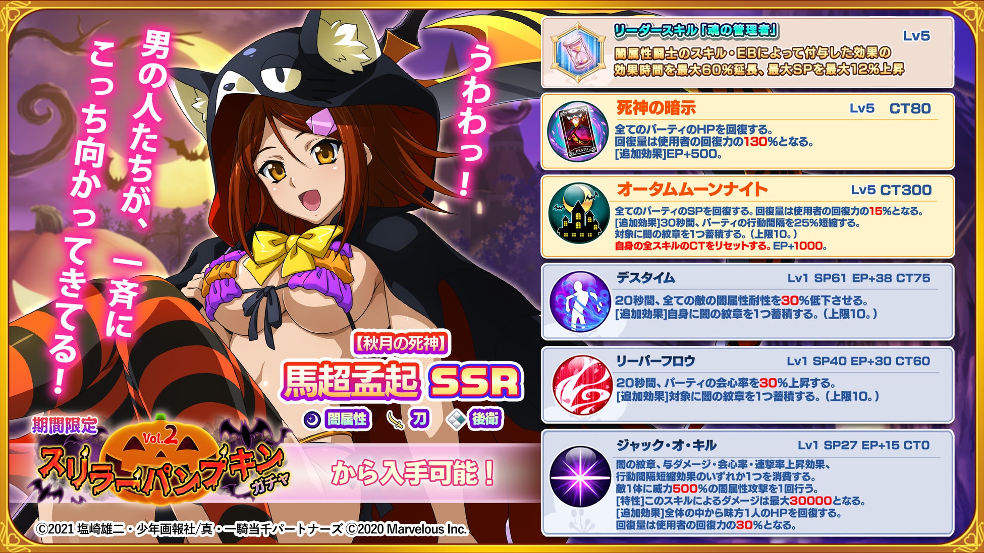 さらに、スリラーパンプキンガチャVol.2では、「【秋月の死神】馬超孟起」の排出率が高くなっています。