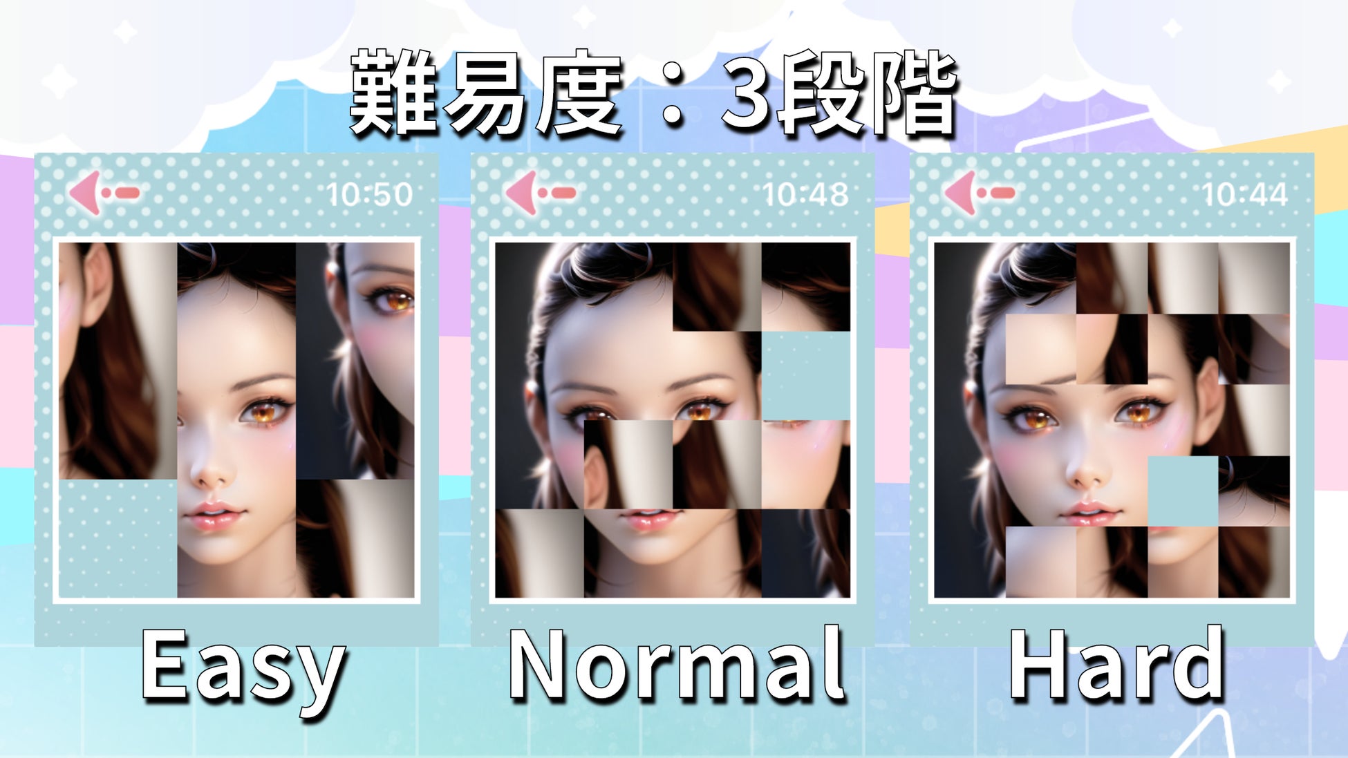 36体のキャラクターが登場し、彼女たちを解放するためにスライドパズルを解かなければなりません。