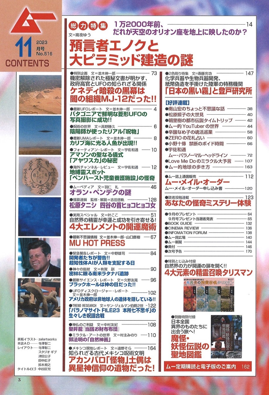 その他にも、ミステリー記事が満載の今月号では、「日本の黒い霧」と登戸研究所、カリブ海に光る人魚の出現、4大エレメントの開運魔術など、興味深い記事が掲載されています。