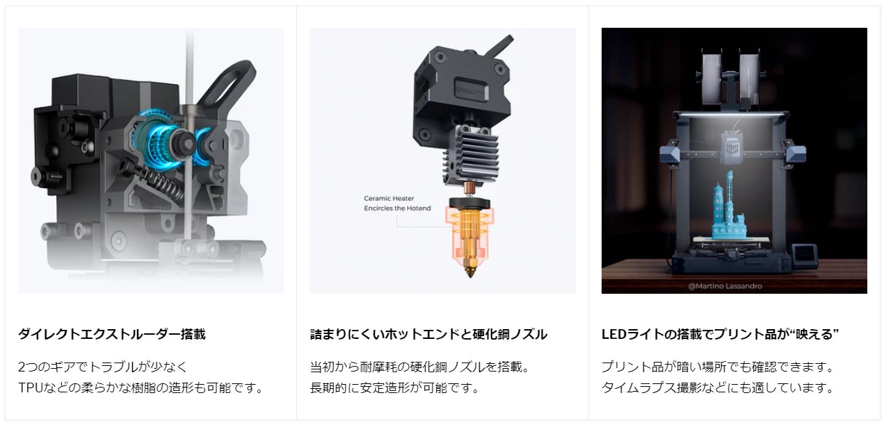 このプリンターは最大600mm/sの造形速度で、硬化鋼ノズルを標準搭載しています。