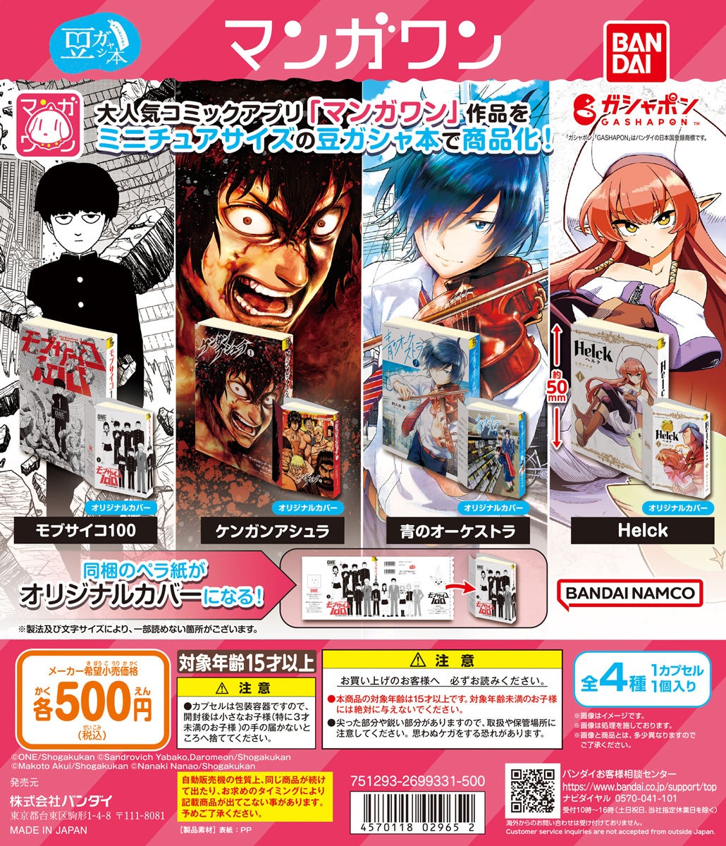商品は全長約5cmのミニチュアサイズで、『モブサイコ100』『ケンガンアシュラ』『青のオーケストラ』『Helck』の4種類を収録しています。