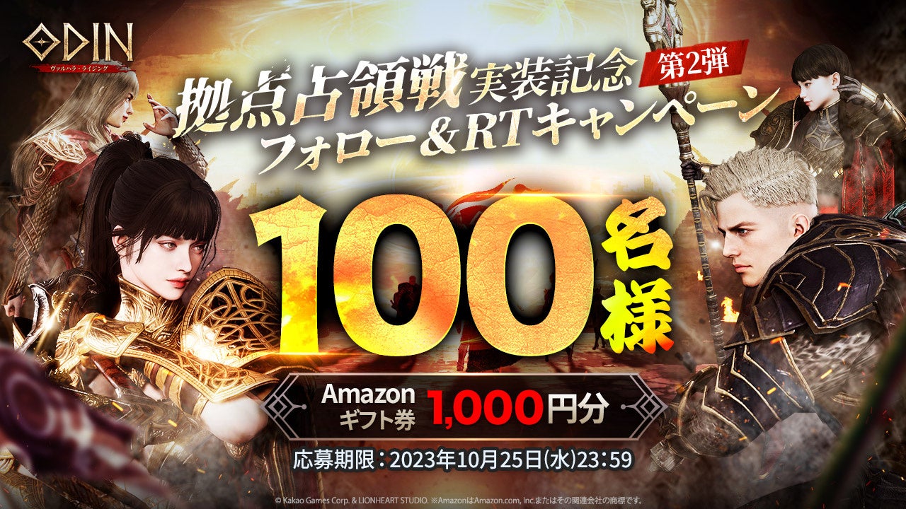 キャンペーンでは、『オーディン:ヴァルハラ・ライジング』公式アカウントをフォローし、キャンペーンポストをリポストすると抽選で100名にAmazonギフト券1,000円分がプレゼントされます。