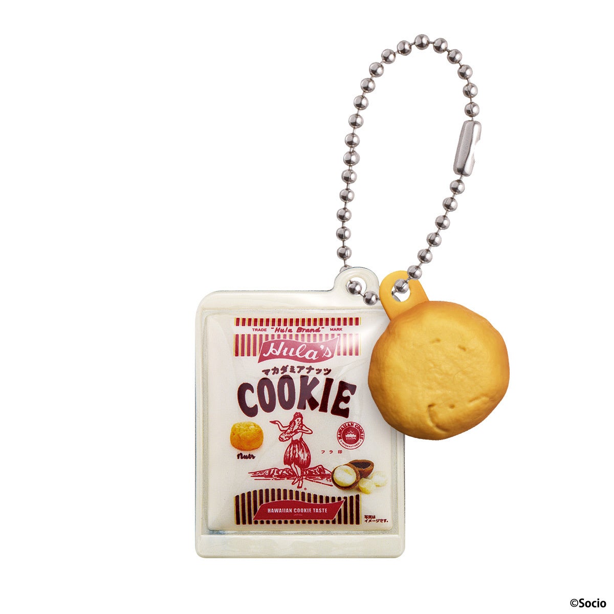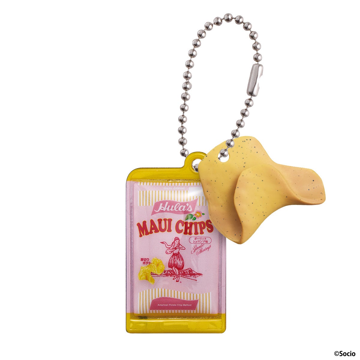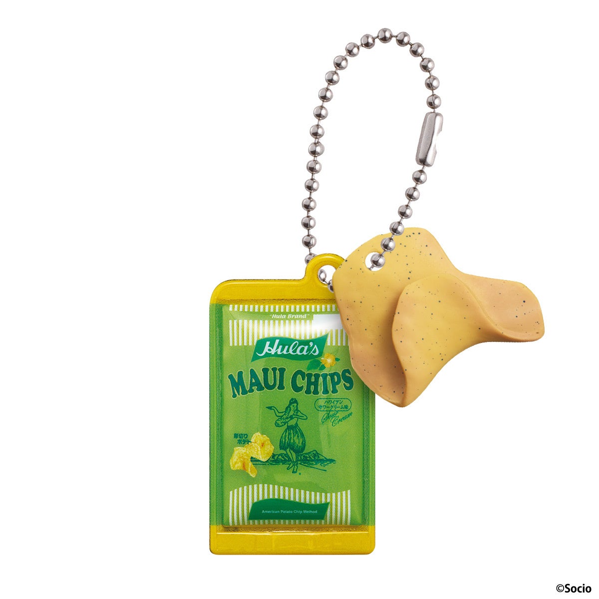 このチャームは、おしゃれで印象的なフラガールのパッケージを持つミニチュアチャームで、アメリカンポテトチップスやマウイチップス、マカダミアナッツクッキーなどの全5種類が揃っています。