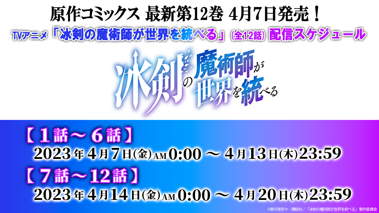 これを記念しまして、講談社が運営するYouTubeチャンネル「フル☆アニメTV」にて、TVアニメ「冰剣の魔術師が世界を統べる」全12話を期間限定で順次無料公開いたします。