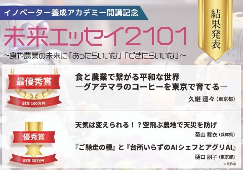 優秀賞作品には「天気は変えられる!?空飛ぶ農地で天災を防げ」と「ご馳走の種」と「台所いらずのAIシェフとアグリAI」という作品が選ばれました。