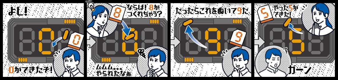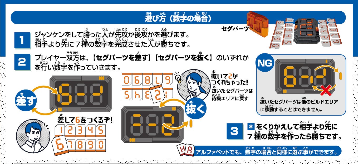 プレイヤーは「0」から「9」までの数字が書かれたカードを持ち、セグパーツを使って数字を作ります。