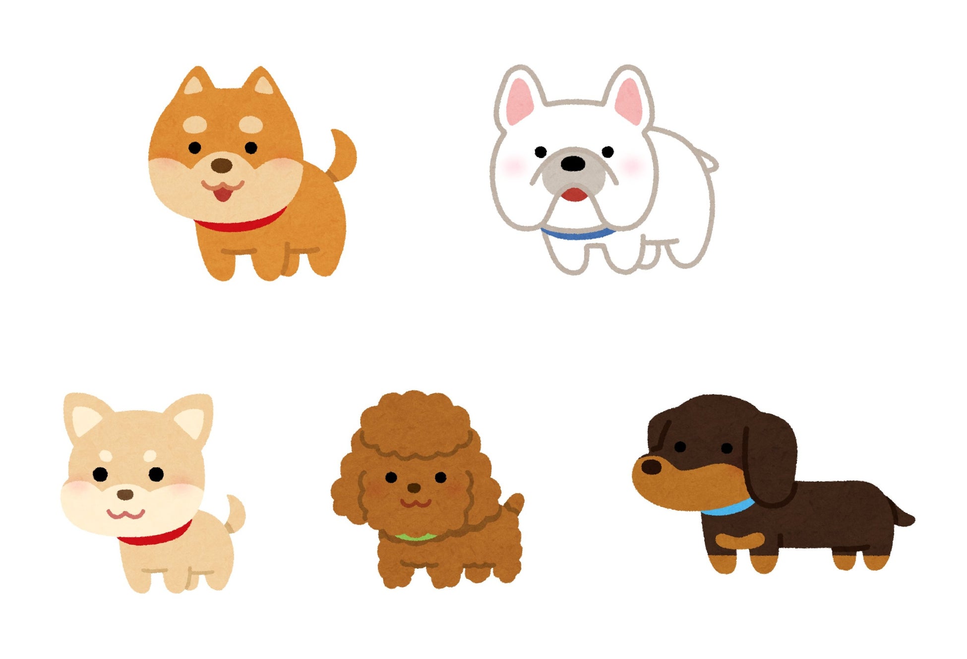 - 柴犬、チワワ、トイプードル、フレンチブルドッグ、ミニチュアダックス