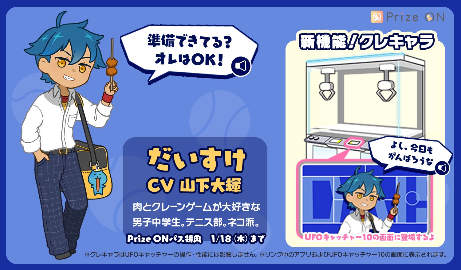 また、『クレキャラ』には声優の山下大輝さんが演じるキャラクター『だいすけ』が登場します。