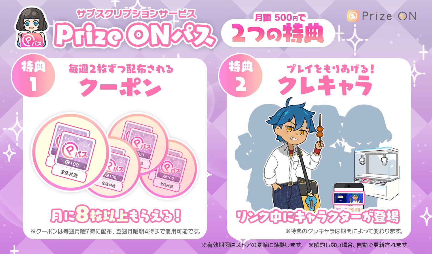 『Prize ONパス』では、毎週もらえる100円無料クーポンや『クレキャラ』の使用権が特典として提供されます。