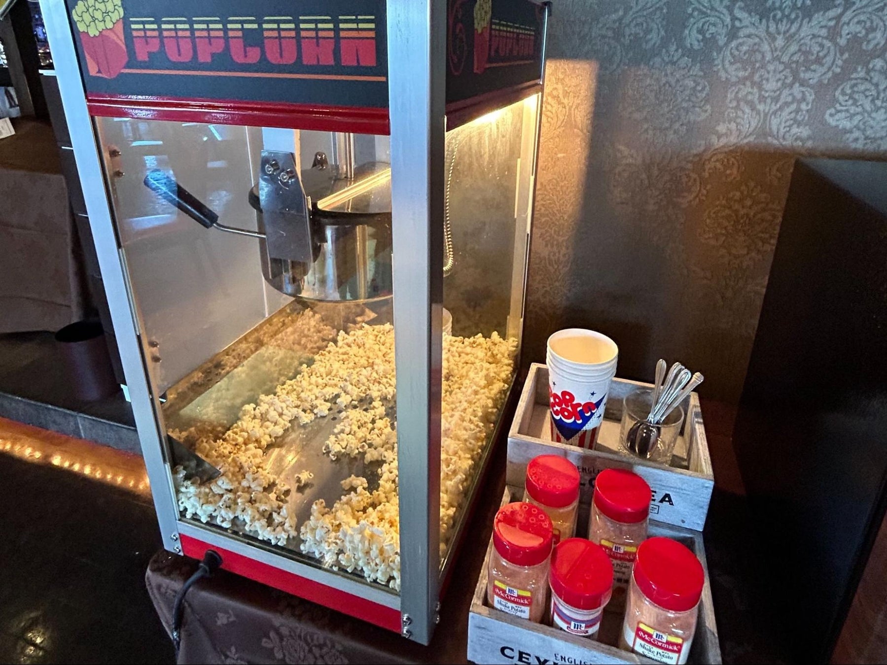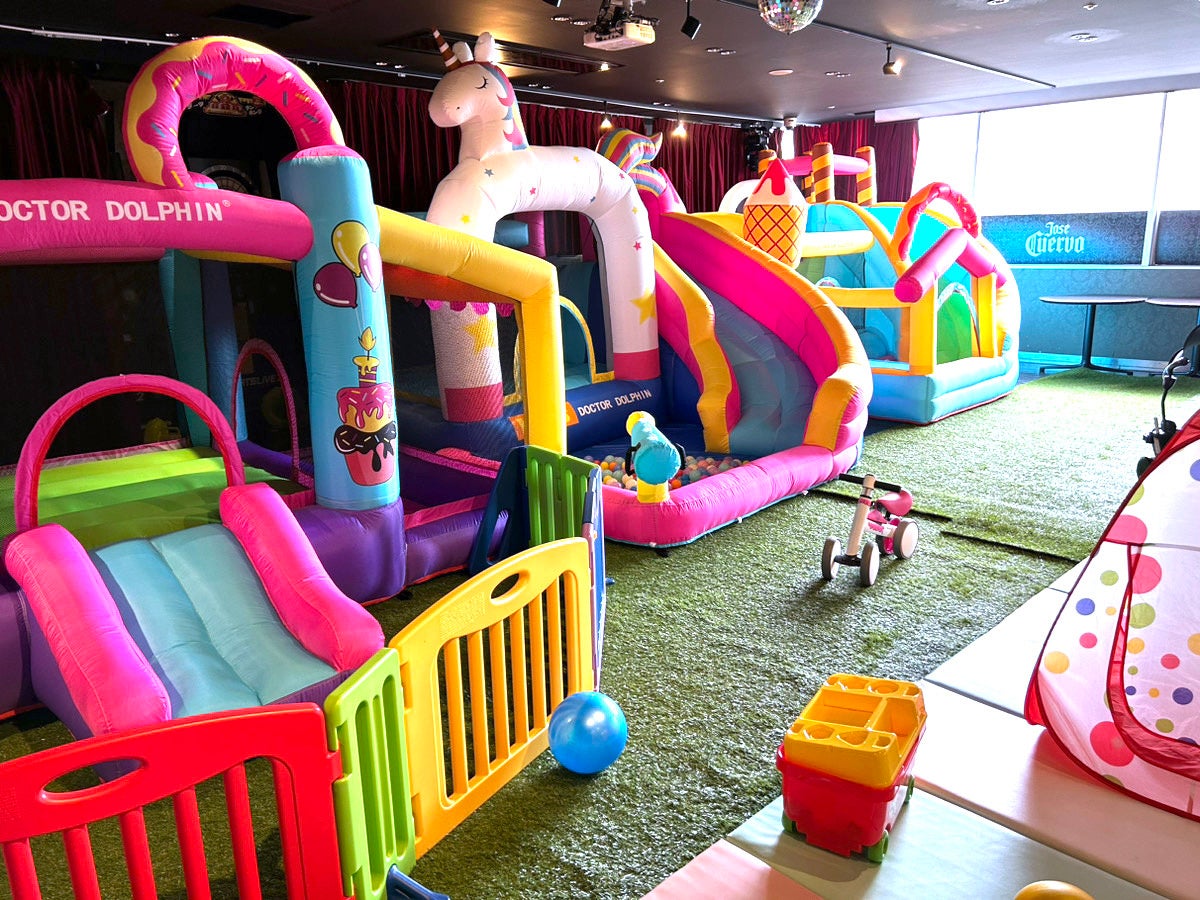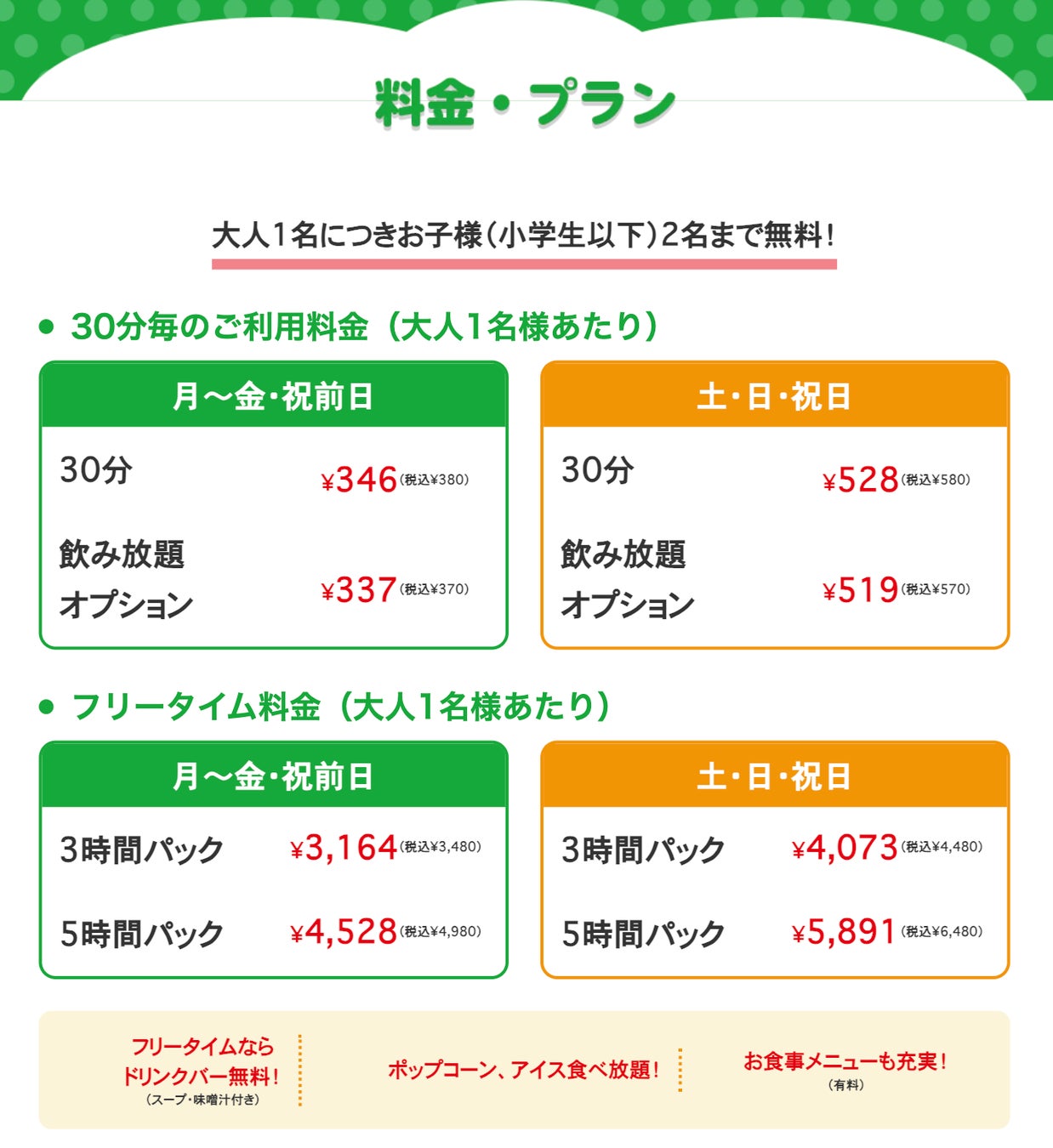 滑り台やレゴブロック、人工芝などの遊具や、ポップコーン食べ放題などのサービスもあります。