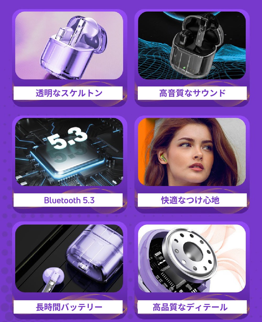 - Bluetoothワイヤレスイヤホンで透明デザインとBluetooth 5.3、ノイズリダクション機能を搭載