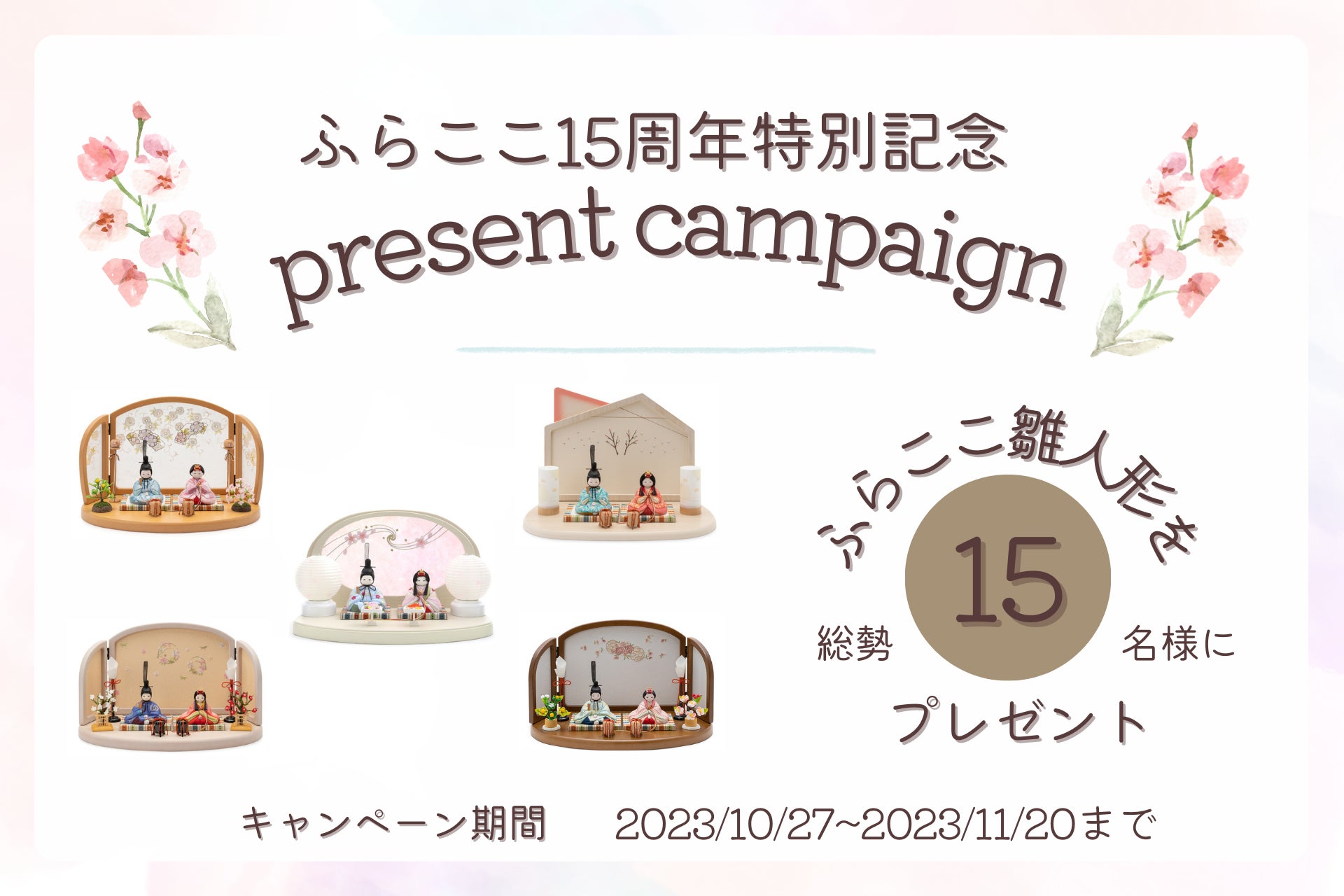 プレゼント商品は15種類の人気雛人形セットで、詳細は公式ウェブサイトでご確認いただけます。