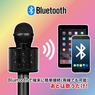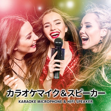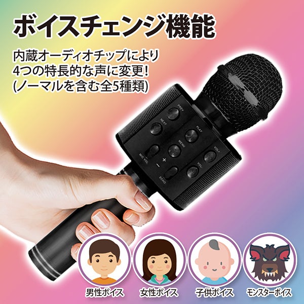 - カラオケマイク&スピーカーはマイクとスピーカーが一体化、ボイスチェンジ機能、Bluetooth接続、ボーカルオフ機能、エコー調整可能