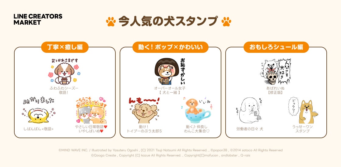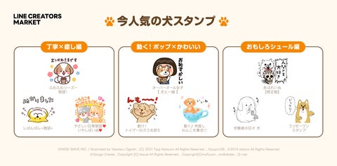 さらに、LINEクリエイターズスタンプでは、人気の犬モチーフスタンプがジャンル別に公開されています。