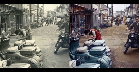 「カラーに蘇る長崎・江戸町」展は、AIカラー化技術ではなくデジタル手彩色技術を使用して制作された写真を展示しています。