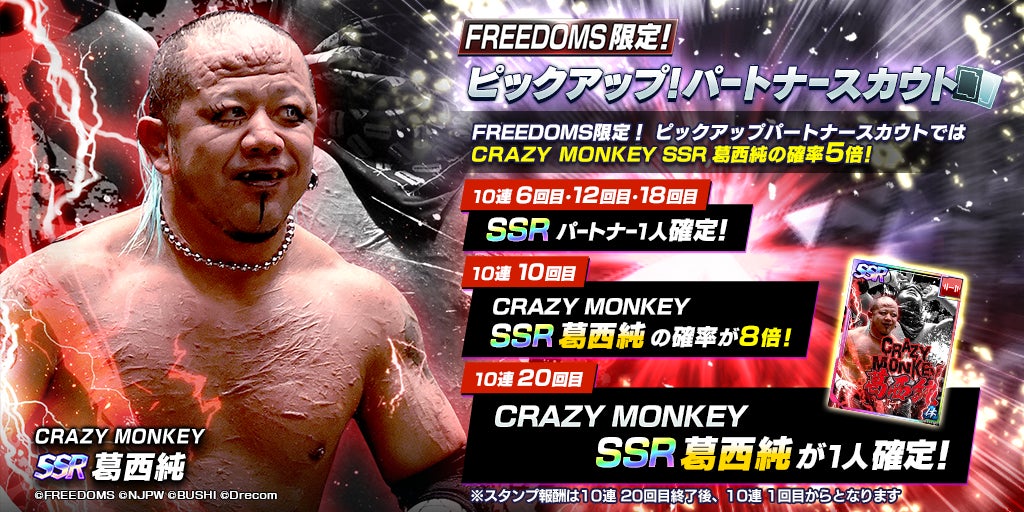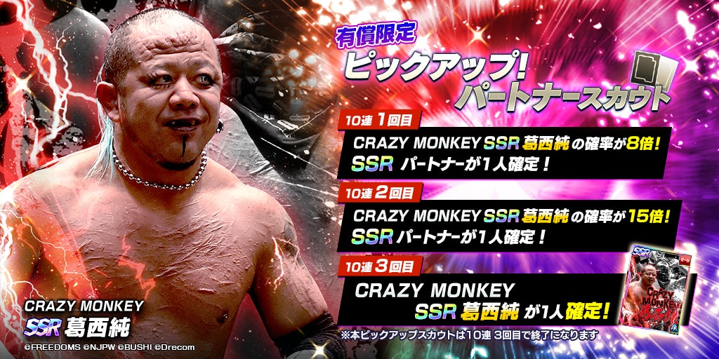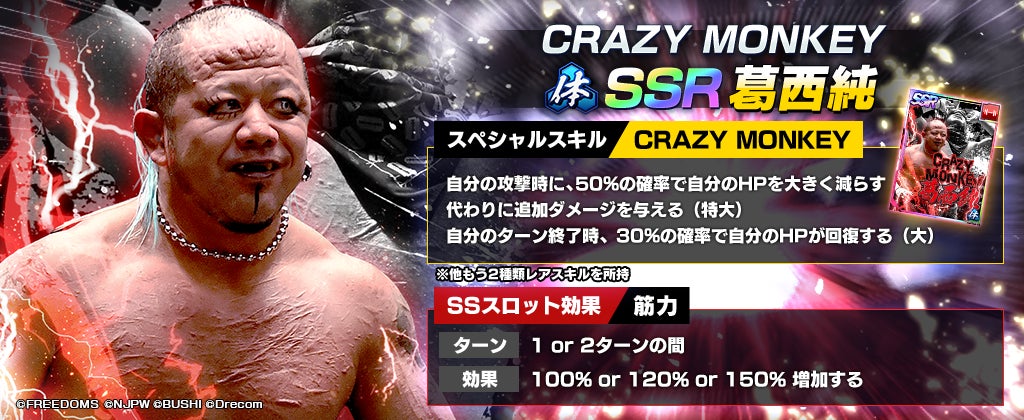 株式会社ブシロードと株式会社ドリコムが共同開発したスマートフォンゲームアプリ『新日本プロレスSTRONG SPIRITS』(以下、新日SS)に、新たなSSRパートナー「[CRAZY MONKEY]葛西純」が登場しました。