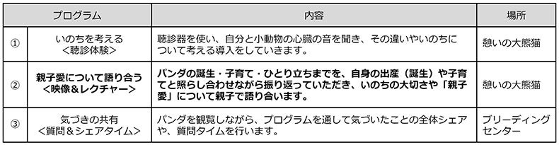 親子で参加できるパンダスクールでは、パンダの誕生について学びながら、自分たちの出産時を振り返り、いのちの尊さを考えることができます。