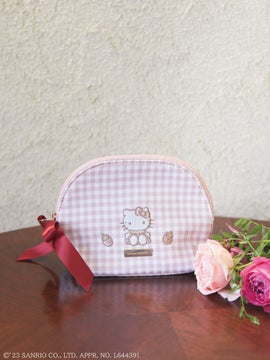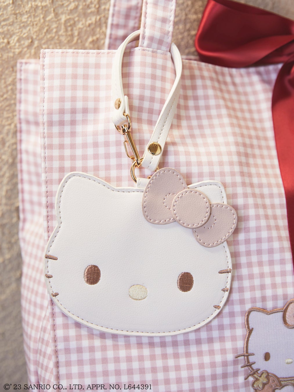 - ピンクカラーのアイテムには、いちごとハローキティの刺繍が施されたトートバッグ、ポーチ、ハンカチ