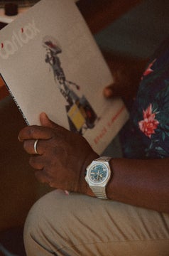 この特別な時計は、カールのターンテーブルからインスピレーションを受けたデザインで、マット仕上げのステンレススチールとイエローゴールドが使用されています。