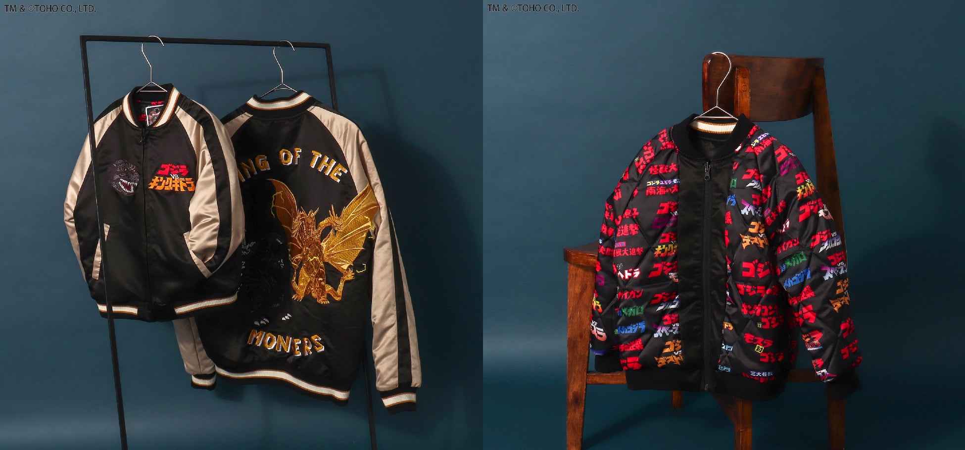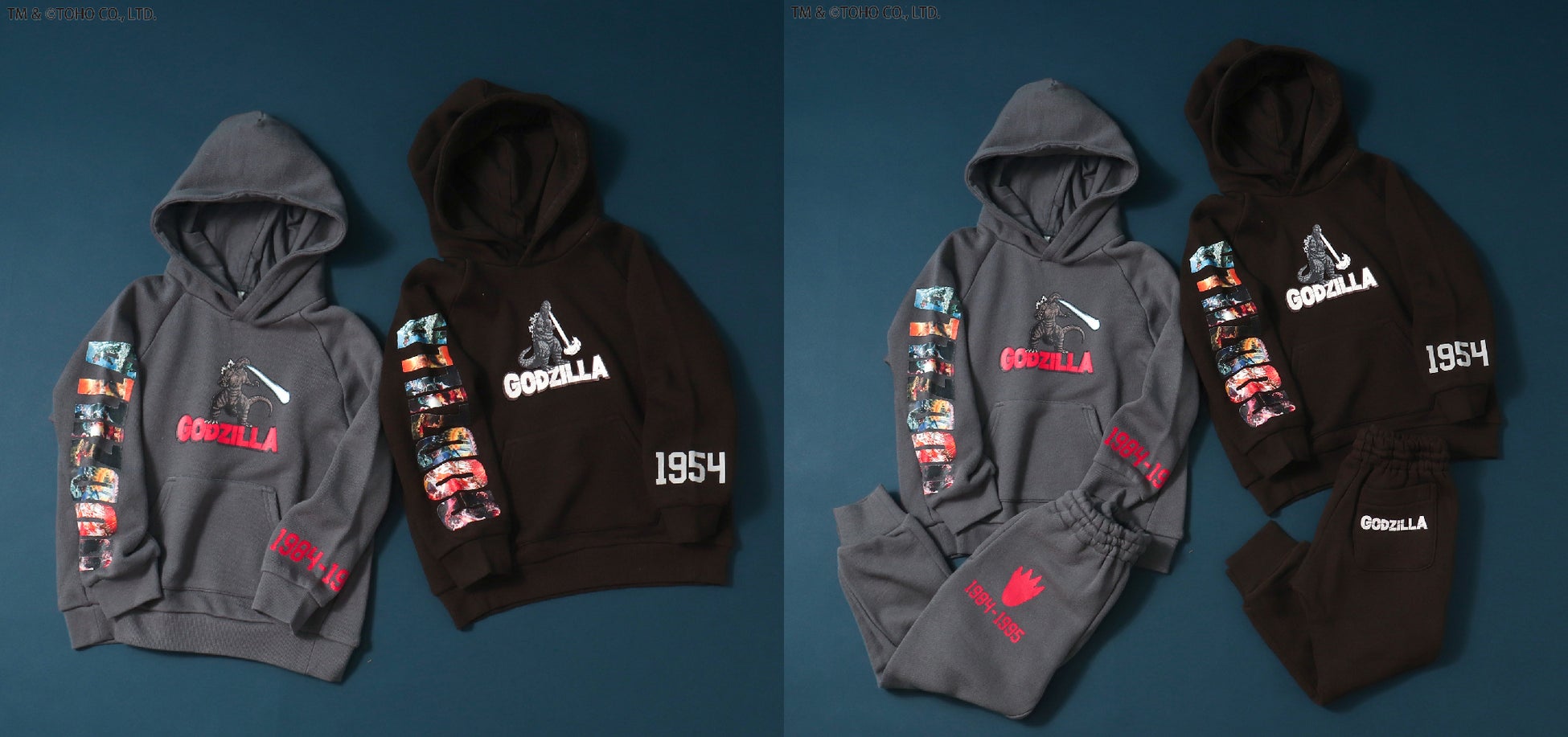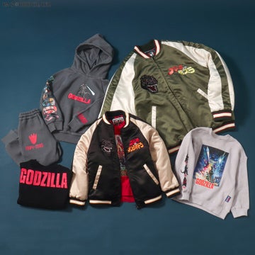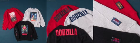 商品ラインナップにはゴジラVSリバーシブルスカジャン、ポスターアートトレーナー、ゴジラスウェットパーカー、ゴジラスウェットパンツがあります。