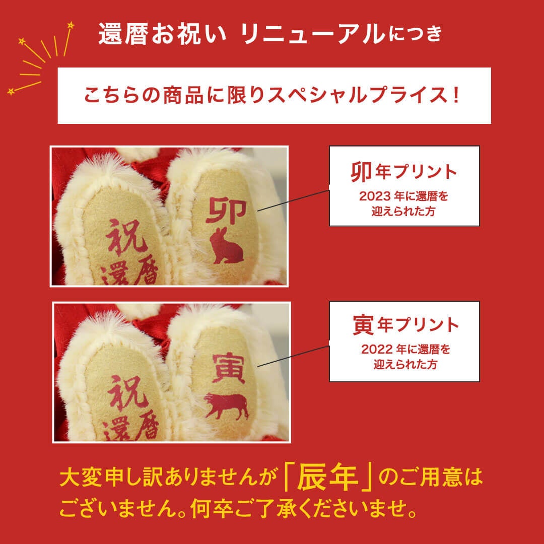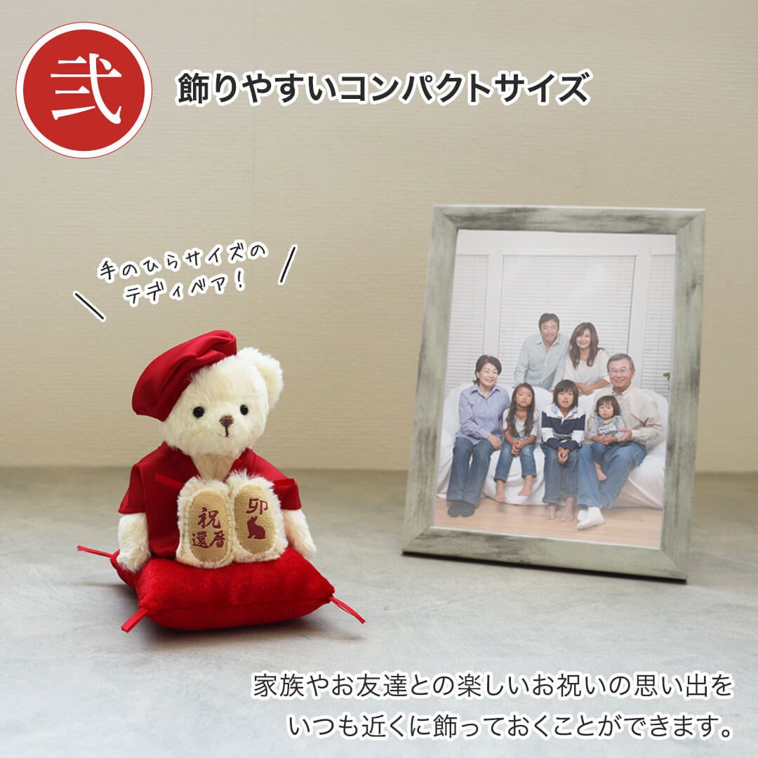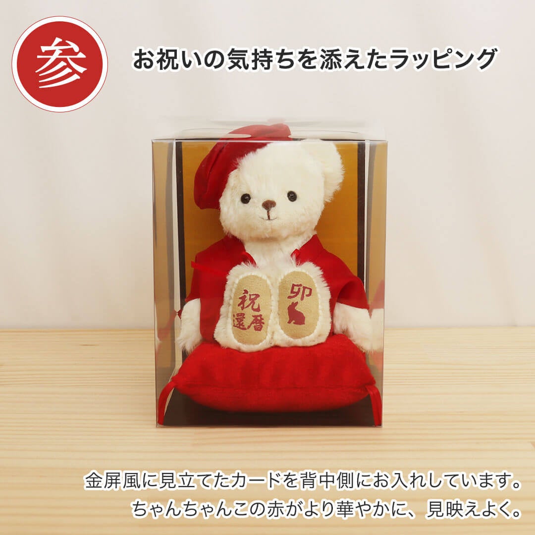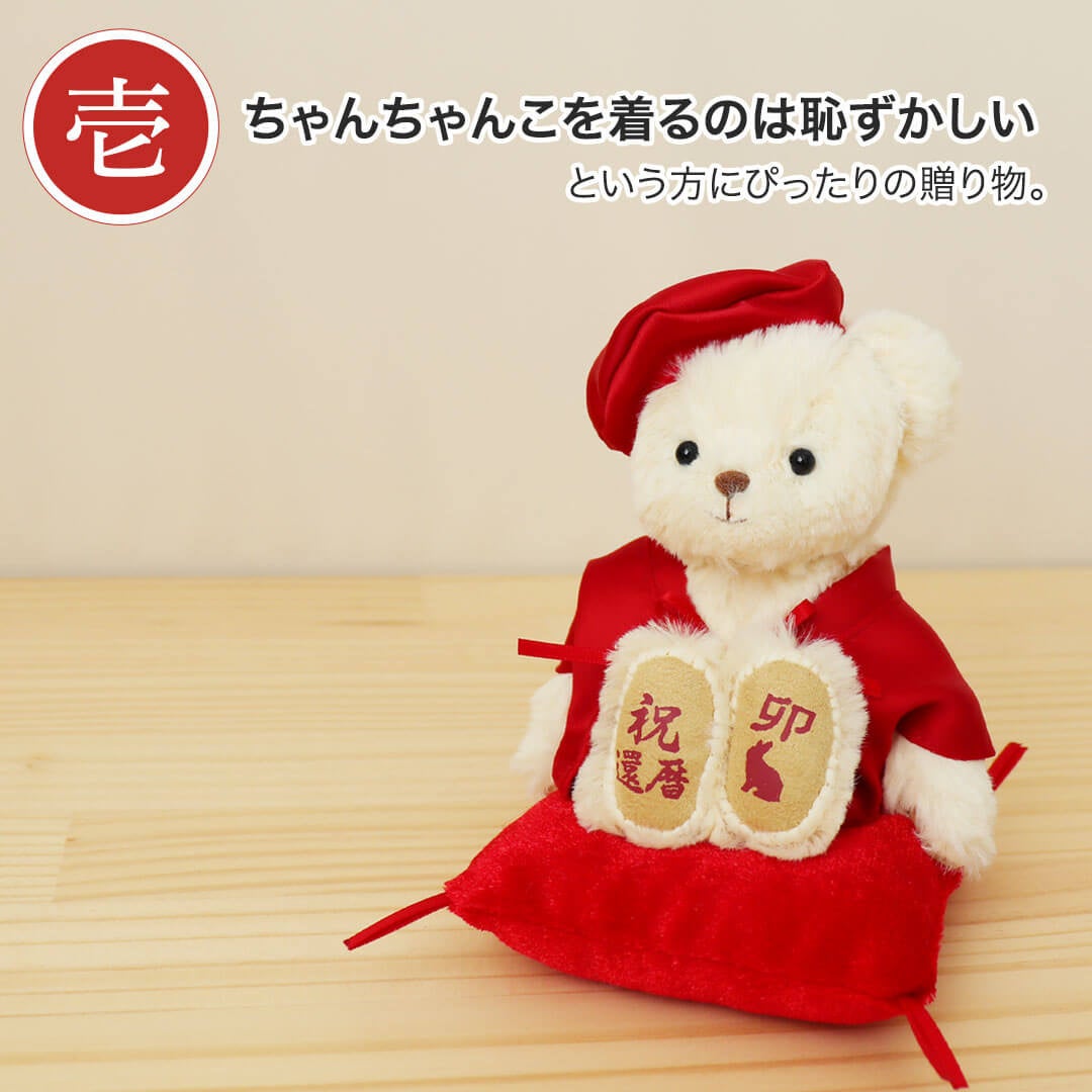赤いちゃんちゃんこを着たユニークなテディベアで、生まれた年の干支と祝還暦のお祝いがプリントされています。