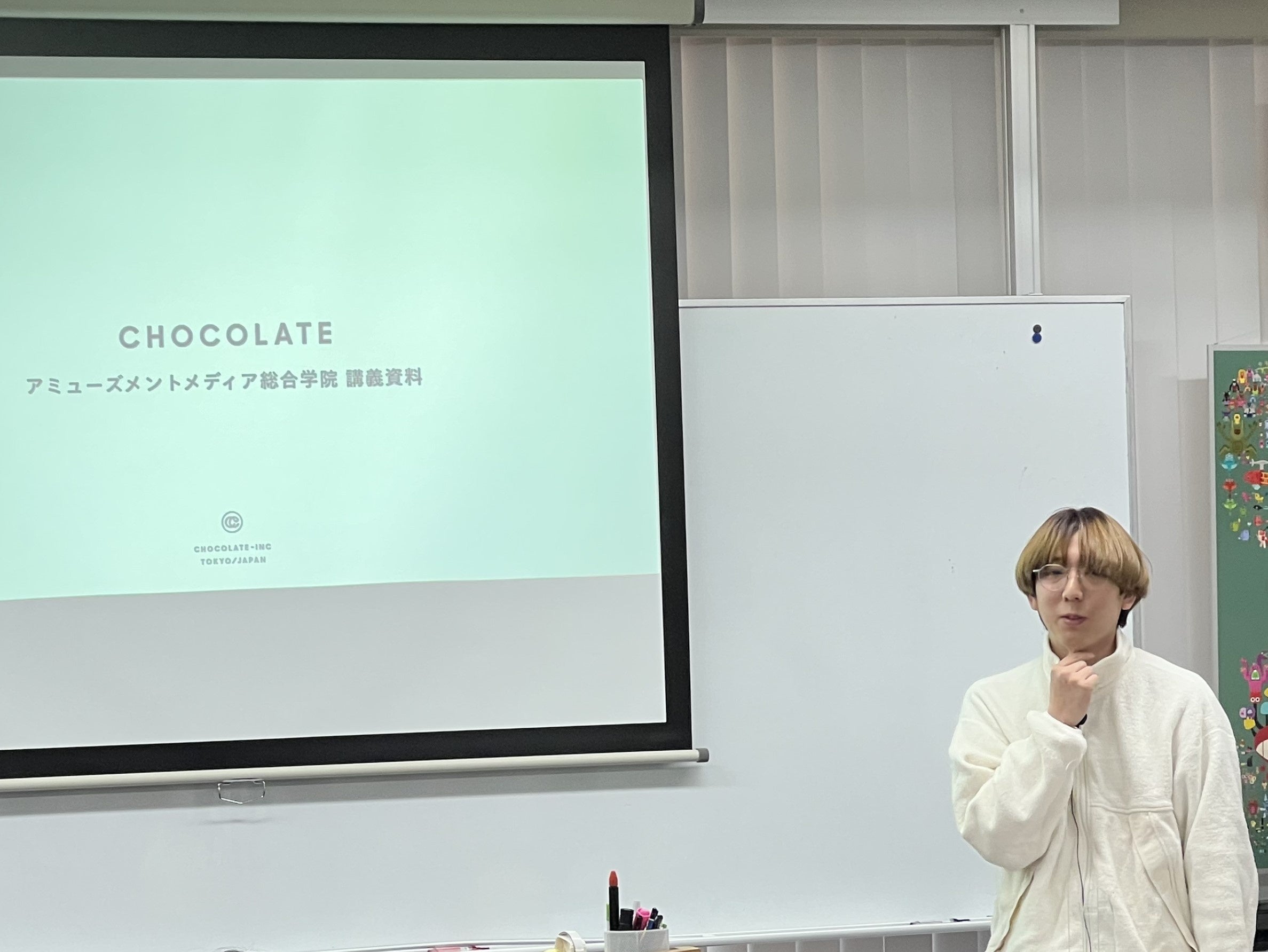 エンタメ業界のプロを育成するアミューズメントメディア総合学院(東京都渋谷区、理事長:吉田 尚剛、以下AMG)は、CHOCOLATE Inc.(東京都渋谷区、代表取締役:渡辺裕介)の武富陵一郎氏をお招きし、特別講義を実施したことをお知らせいたします。
