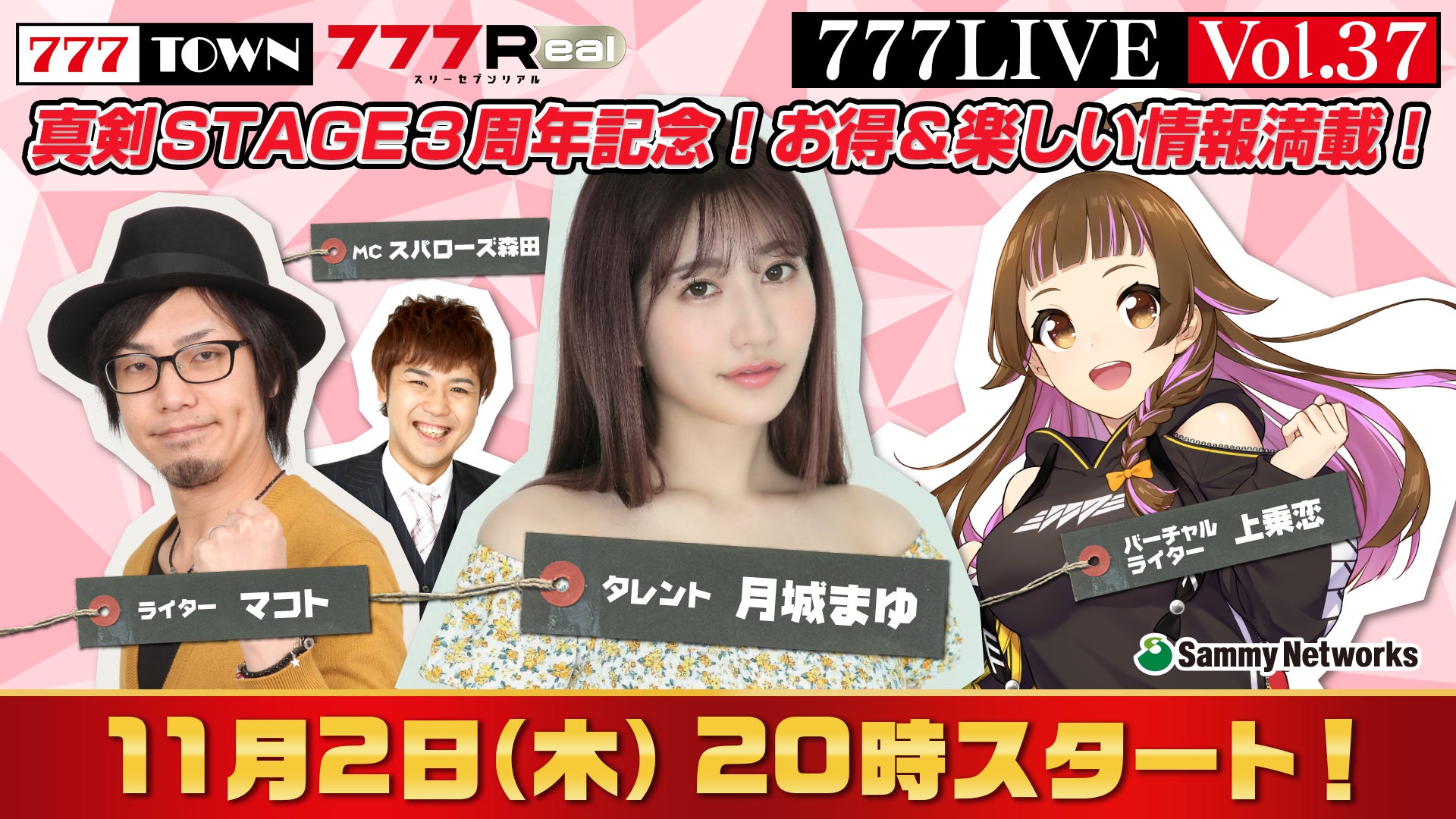 株式会社サミーネットワークスは、2023年11月2日(木)20時から、ぱちんこ・パチスロがパソコンやスマホで楽しめる「777TOWN」と「777Real」の生放送を配信します。