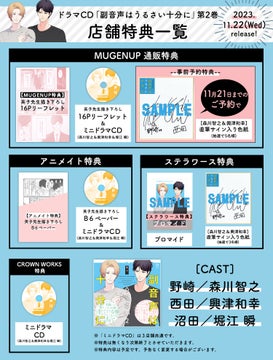 – MUGENUPストア:https://shop.mugenup-pub.jp/products/hukuonsei-dramacd – Amazon:https://amzn.asia/d/9aVL7R5 – アニメイト:https://www.animate-onlineshop.jp/pn/pd/2316634/ – CROWN WORKS:http://dn-e.jp/shop/products/detail.php?product_id=176 – ステラワース:https://www.stellaworth.co.jp/shop/item.php?item_id=eAyamgEeEom 【ミニドラマCD収録内容】 ミニドラマCDには、コミックス1巻と2巻の描き下ろし漫画、ドラマCD1巻と2巻のMUGENUP特典描き下ろし漫画が収録されます。