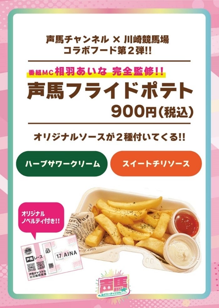 さらに、番組コラボ商品の「声馬ビール」と「声馬フライドポテト」も販売されており、川崎競馬場2号スタンド店で購入することができます。