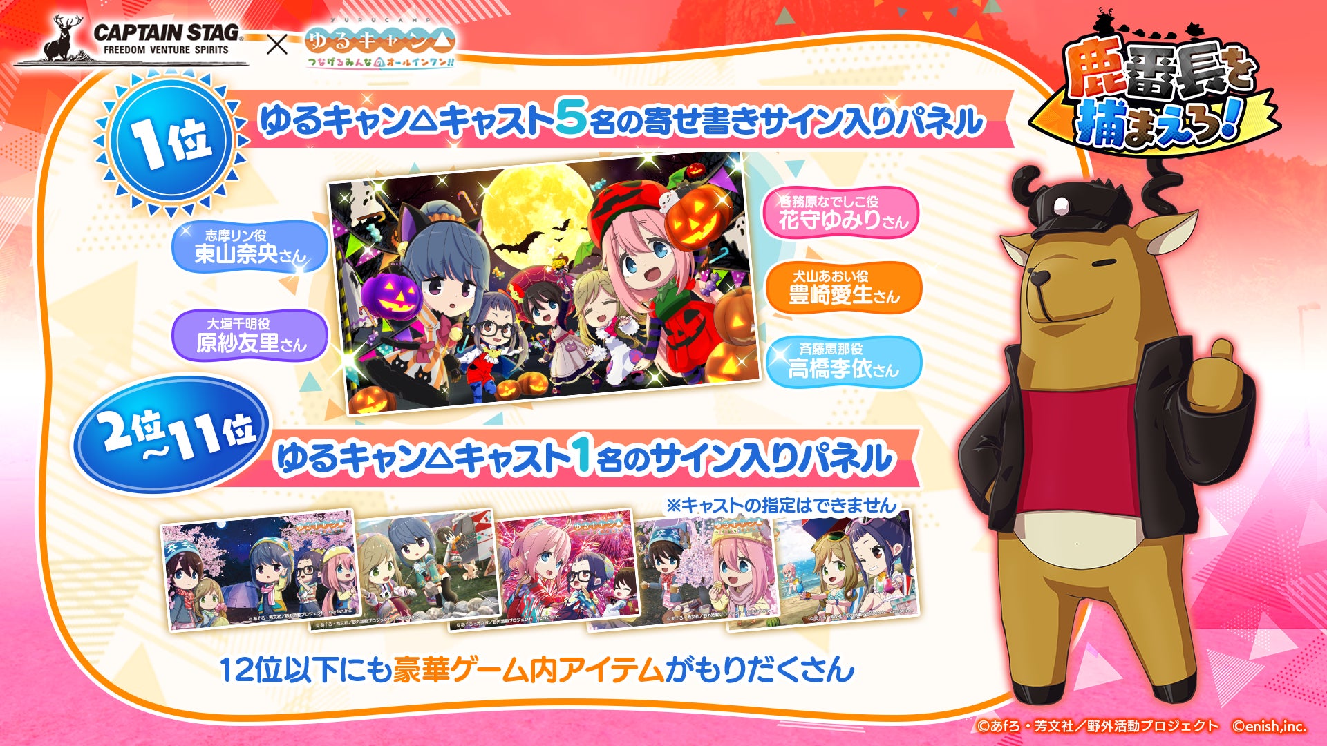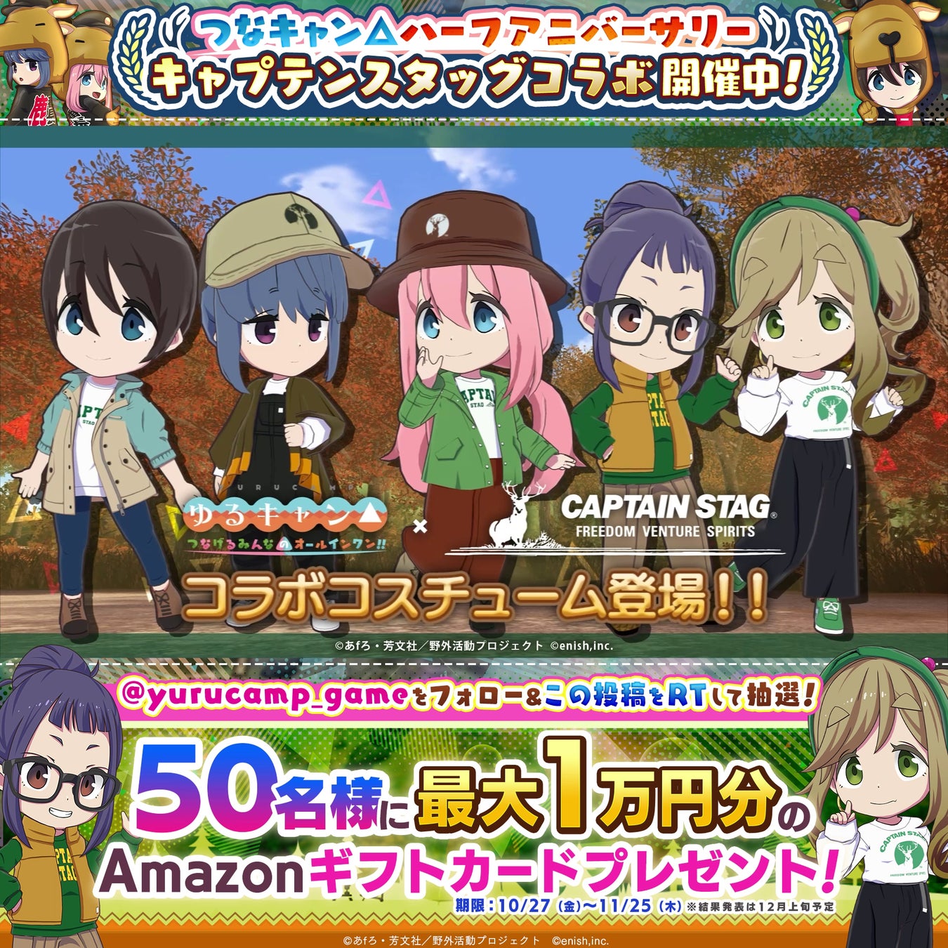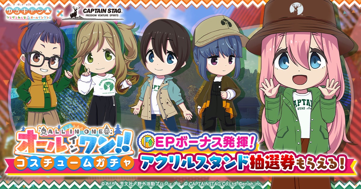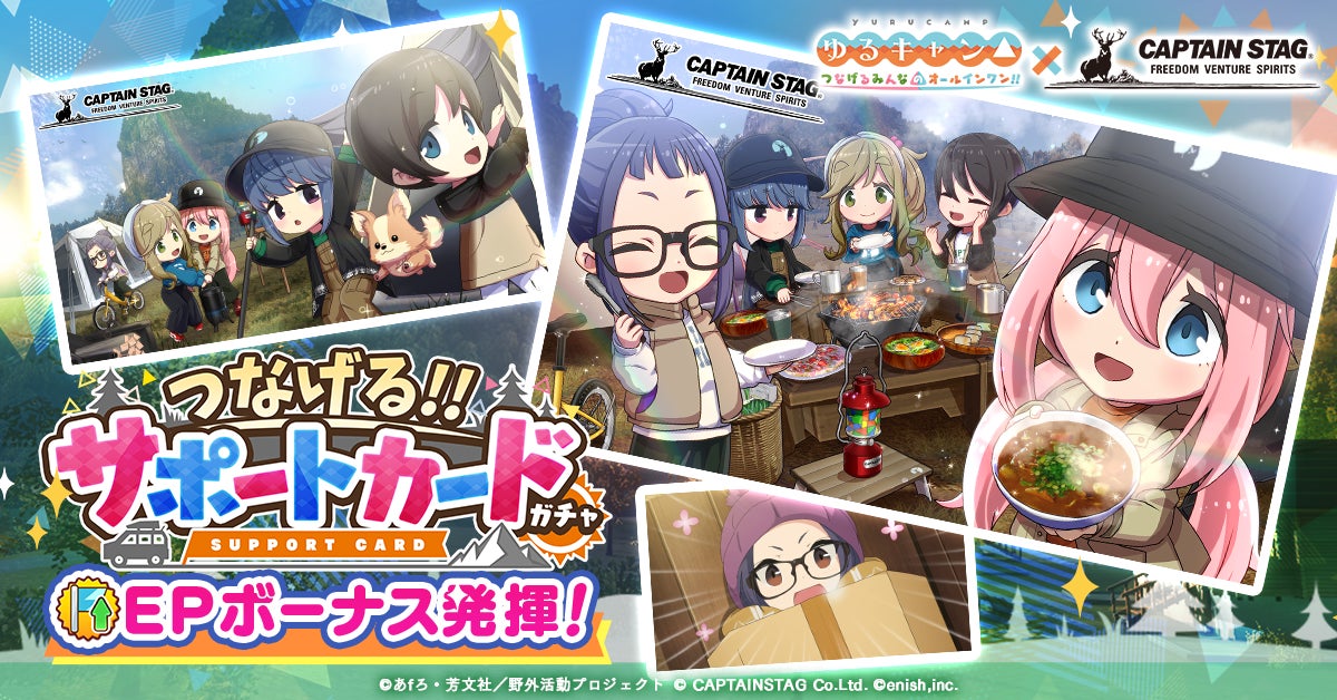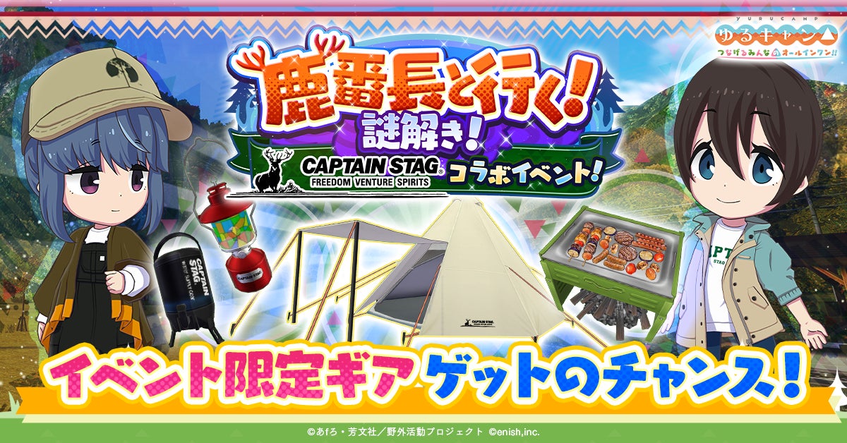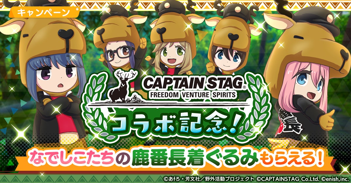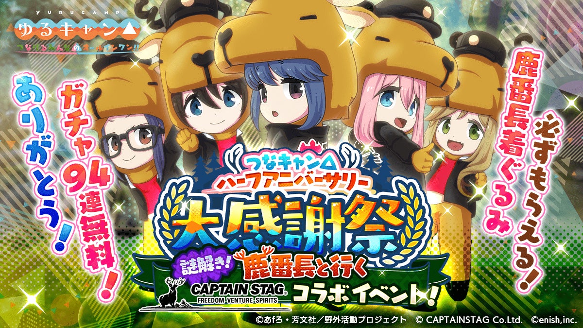株式会社enishは、TVアニメ『ゆるキャン△』初のオンラインゲーム「ゆるキャン△ つなげるみんなのオールインワン!!」にて、「キャプテンスタッグ」とのコラボ&つなキャン△ハーフアニバーサリー感謝祭を開催中です。