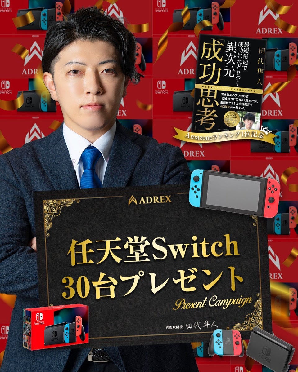 この喜ばしい成果を祝して、アドレクスは任天堂Switchを抽選で30名にプレゼントするキャンペーンを開始しました。