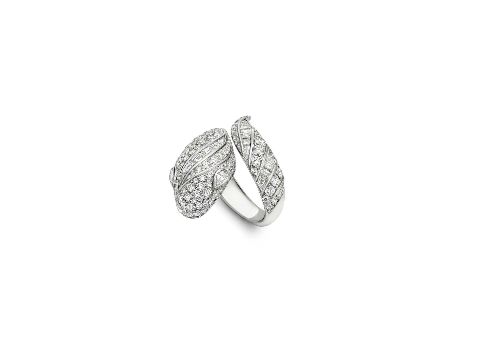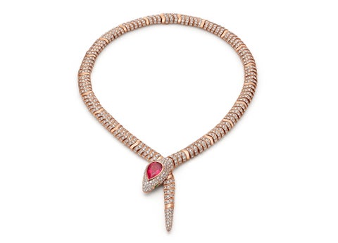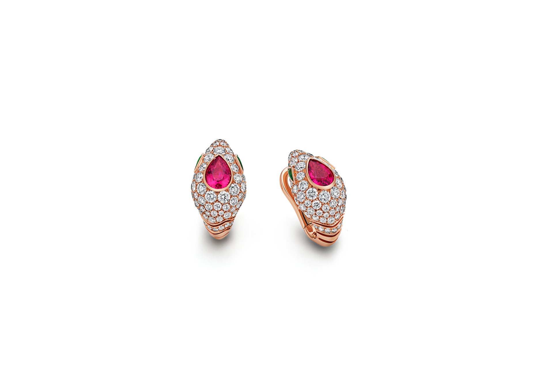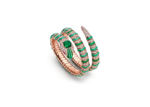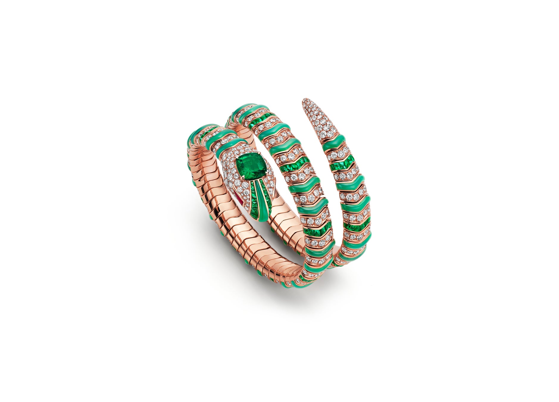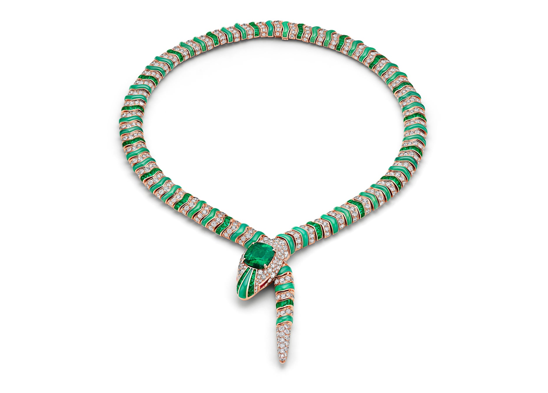 - ブルガリのハイジュエリーコレクションも展示され、特にエメラルドのセルペンティネックレスやダイヤモンドのセルペンティリングが注目される