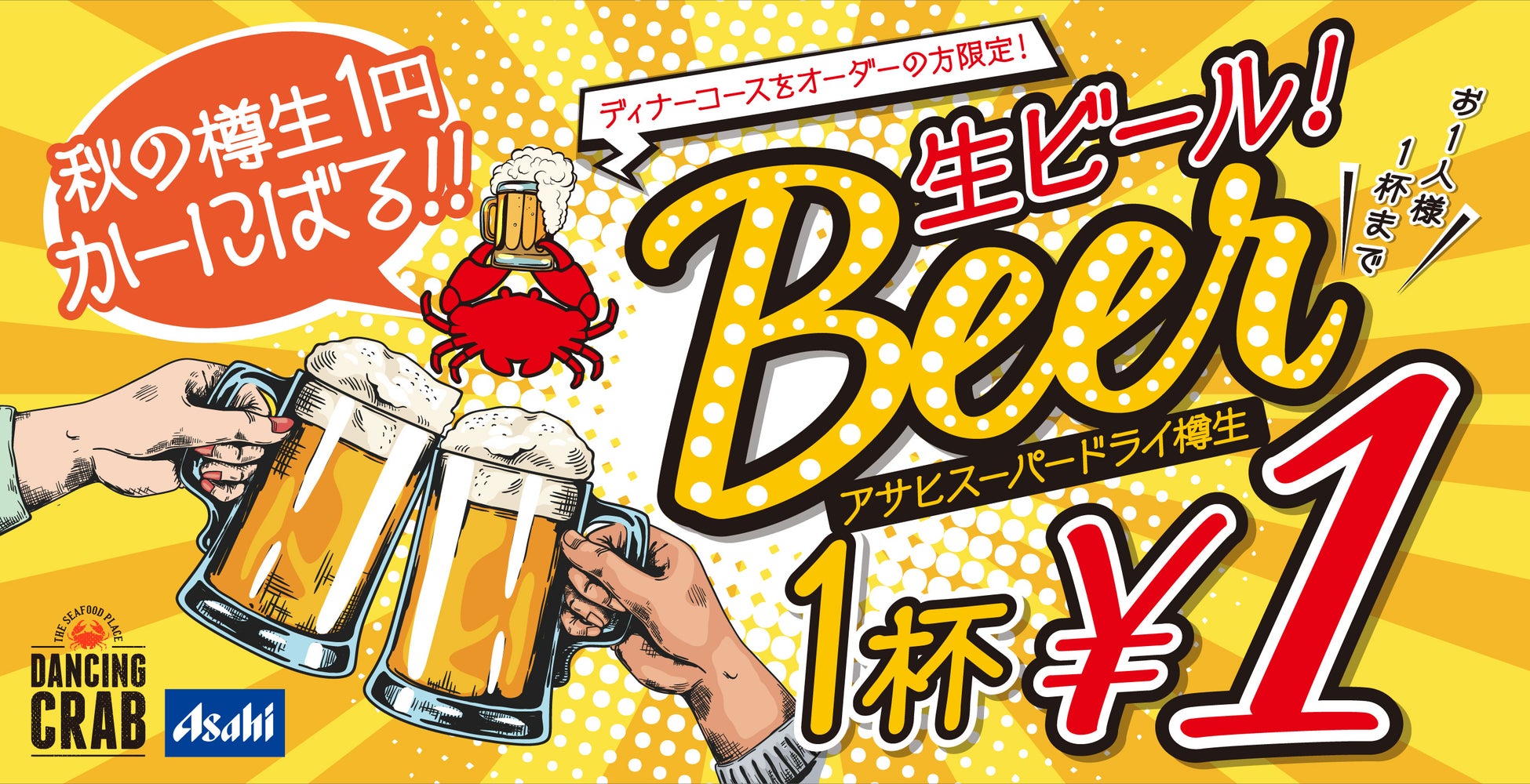 ディナータイムに人気の手づかみコースや贅沢なシーフードの手づかみコースを注文すると、アサヒスーパードライ樽生がたった1円で提供されます。