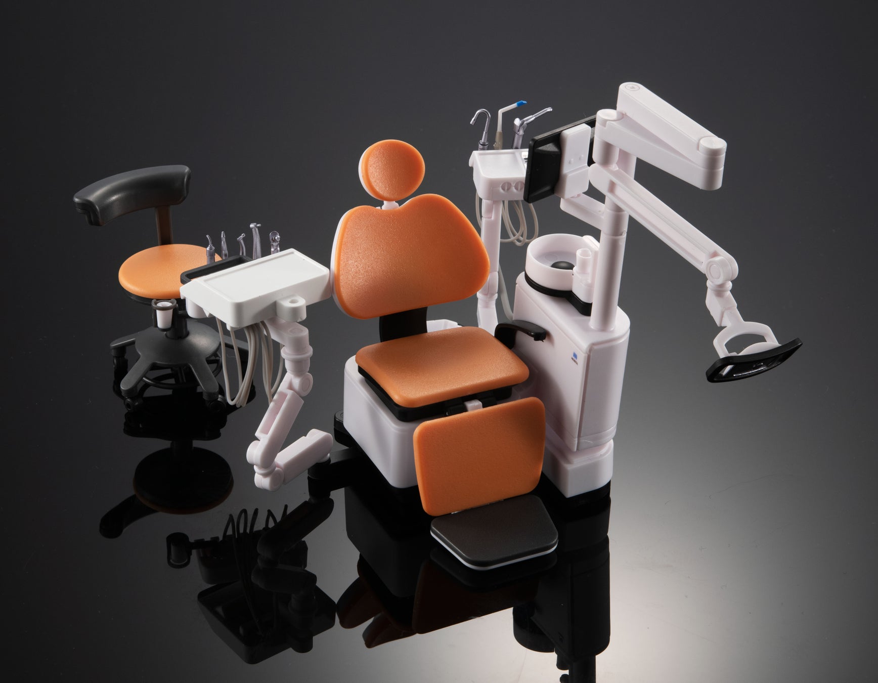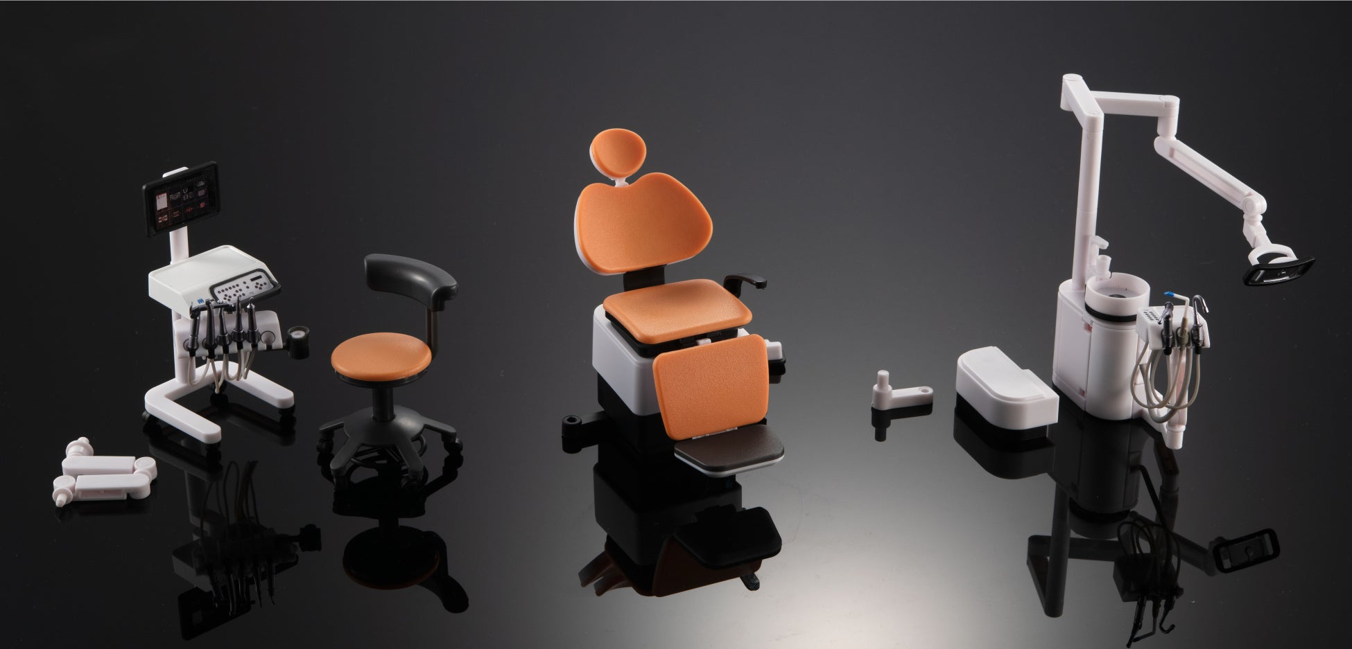 1/12のサイズで再現したリアルフィギュアで、歯科チェア、歯科衛生士パート、歯科医パートの3つを集めると完成します。患者用チェアは前後・上下に可動、歯科衛生士パート(アシスタント側)と歯科医パート(術者側)のコードについたパーツを動かすこともでき、治療中に行われる動作を再現することができます。