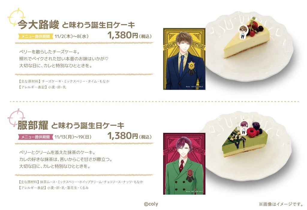 期間中、『coly cafe! 池袋PARCO店』では、今大路峻と服部耀のバースデーガチャのカードに描かれたケーキを販売します。