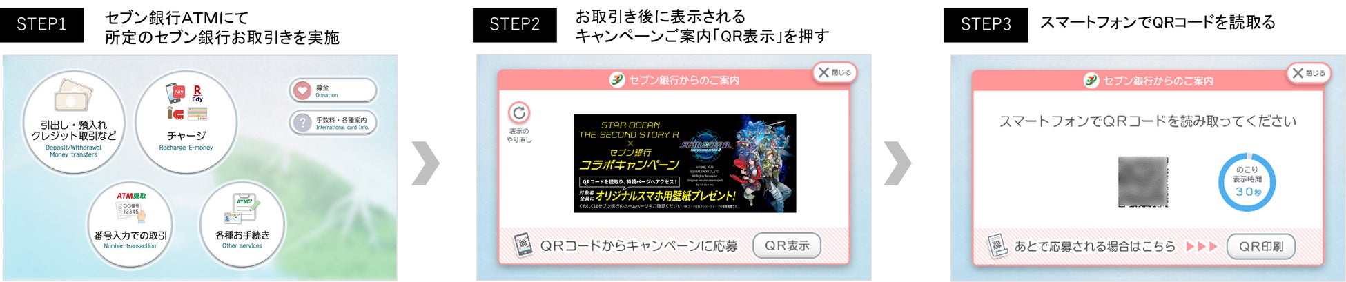 セブン銀行ATMでの入出金やスマホATMの取引が対象で、取引の最後にQRコードが発行されます。
