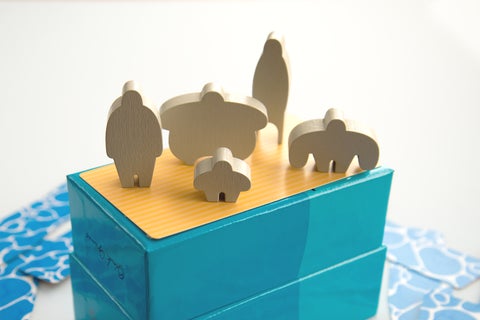 『いかだの5人』は、5つの異なる形の人コマを使っていかだを大きくしながら、宝箱を積んでいくバランスゲームです。