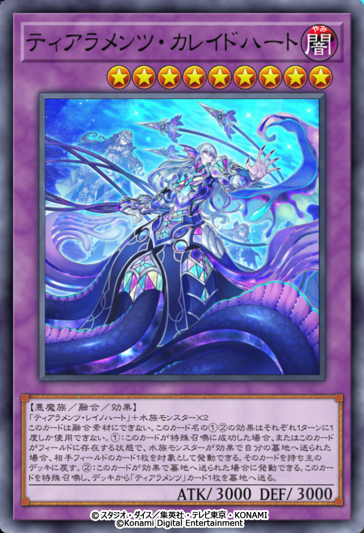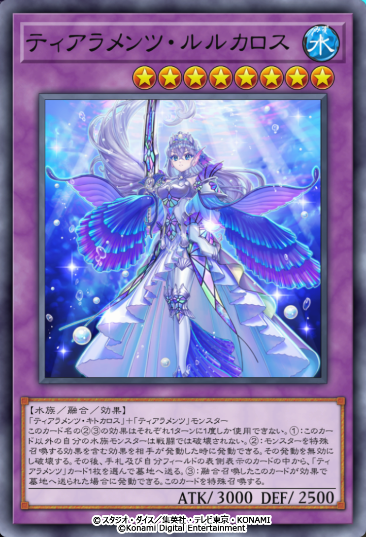 このカードは融合素材にできない。このカード名の①②の効果はそれぞれ1ターンに1度しか使用できない。①:このカードが特殊召喚に成功した場合、またはこのカードがフィールドに存在する状態で、水族モンスターが効果で自分の墓地へ送られた場合、相手フィールドのカード1枚を対象として発動できる。そのカードを持ち主のデッキに戻す。②:このカードが効果で墓地へ送られた場合に発動できる。このカードを特殊召喚し、デッキから「ティアラメンツ」カード1枚を墓地へ送る。