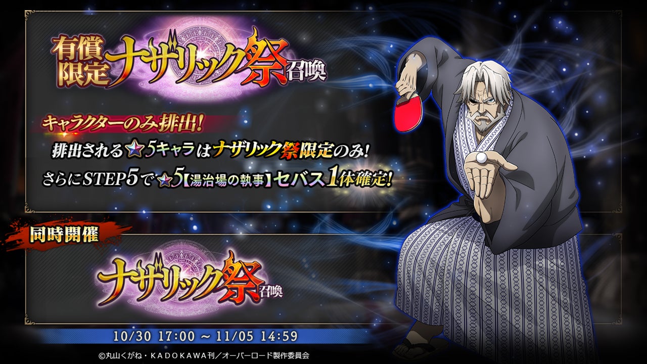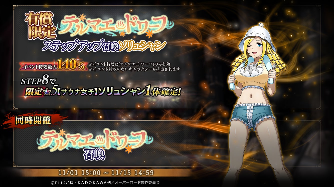 11月1日から、イベント『テルマエ・ドワーフ』が開催されます!このイベントでは、『★5 【サウナ女子】ソリュシャン』や『★5 【湯治場の執事】セバス』などのキャラクターが召喚で登場します。