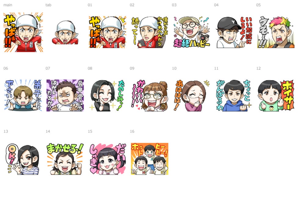YouTubeチャンネル「カジサック」でおなじみのフレーズやギャグが詰まった16個のスタンプです。