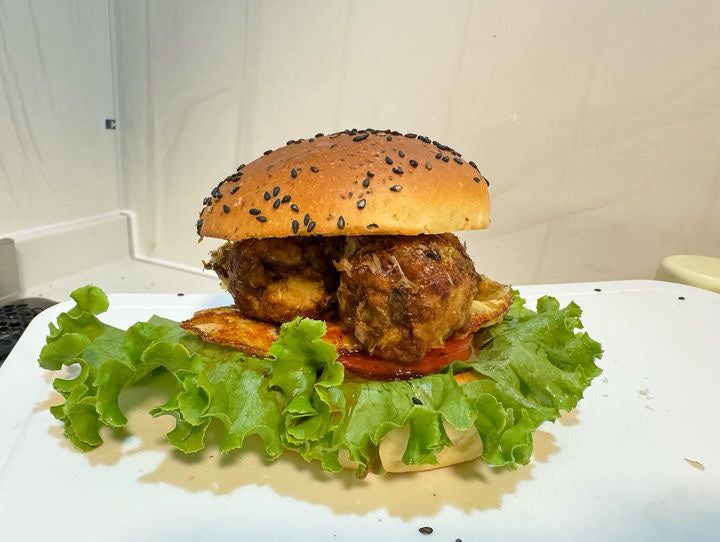 - たこ焼きとハンバーガーを一緒に楽しめる一品が完成